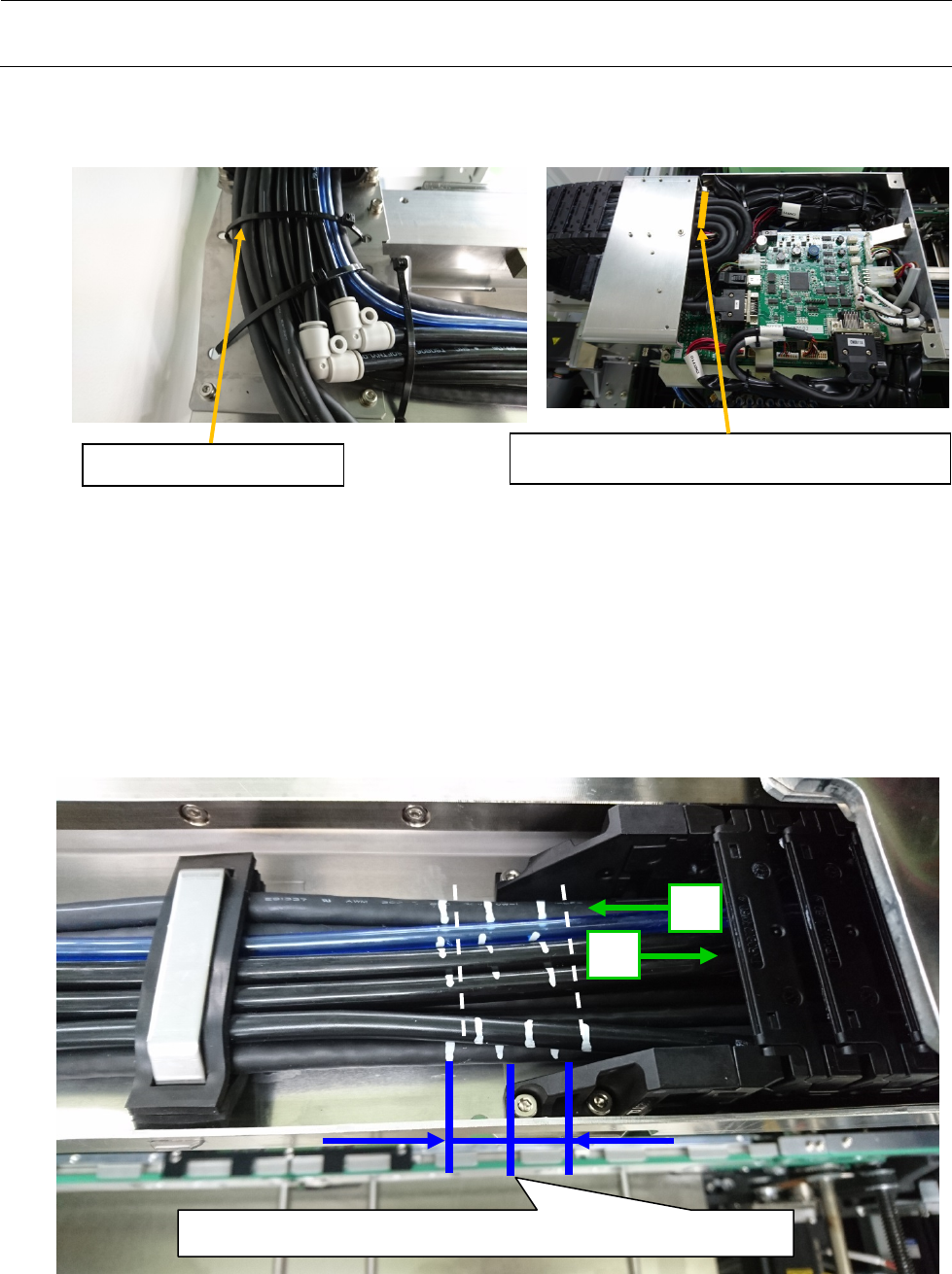 调整线束,使 2 条记号的中间位置成为 Y 电缆拖链的端部(移动端部),予以固定。