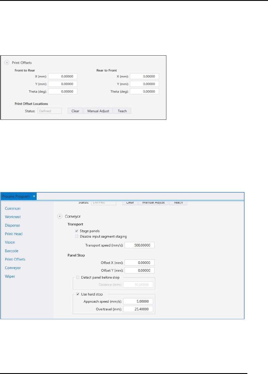 Figure 70 shows the setup screen for the conveyor. Set transport speeds and coordinates for panel