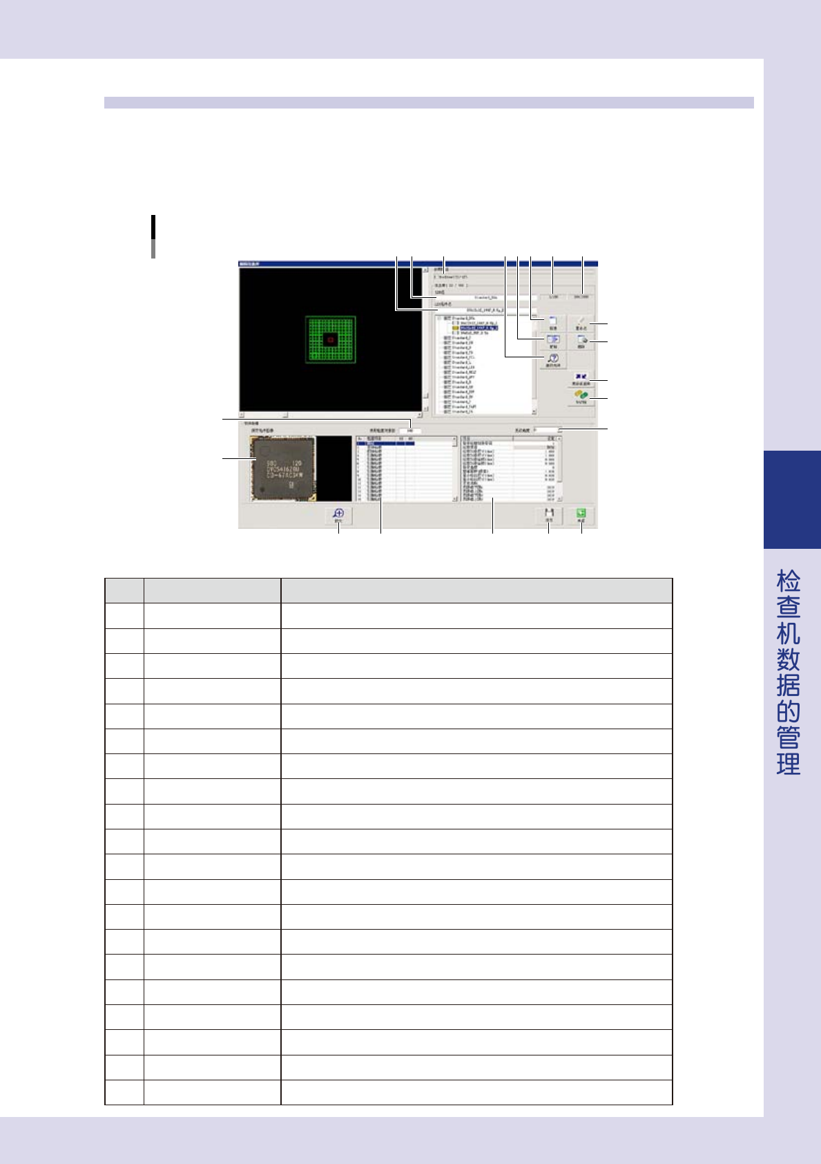 4-5 4 1.2 信息库的编辑 1.2.1 信息库的详细设置 在 [ 数据编辑 ] -「检查对象」画面,按「基本」参数选项卡的 [ 详细 ] 按钮,打开「编辑信息库」画面。可以在此 画面对登录的信息库进行编辑。以下,介绍「编辑信息库」画面的主要功能。 「编辑信息库」画面 4 5 6 7 8 9 10 1 2 3 11 12 13 15 14 16 17 18 19 20 26408-P9-00 项目 / 按钮名 内容 1 参照路径 显…
