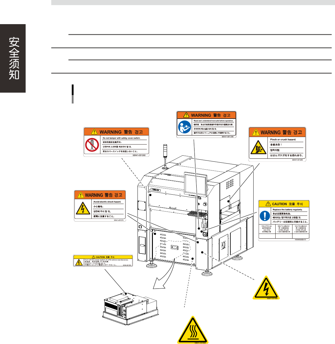 为了安全使用机器,如下图所示,在设备各个部位张贴了警告标贴,务必严格遵守标贴指示。此外,关于本节所