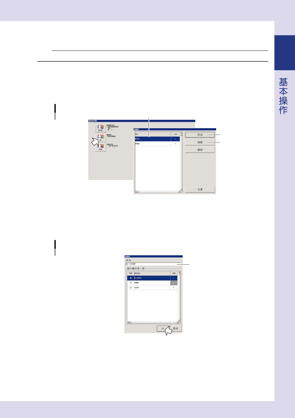 1-25 1 ■ 组的编辑 以下,介绍更改或添加组名、添加或删除操作者的方法。 n 要点 此操作仅限管理人员 ( 级别 10) 可执行。 1 按「系统设置」画面的 [ 操作者管理 ] 按钮。 显示「操作者管理」画面。 2 按 [ 组 ] 按钮,打开「组编辑」画面。 「组编辑」画面 1 3 2 26134-P9-00 1. 组名、人数 以列表形式显示登录的组名及该组的操作者人数。 2. [ 添加 ] 按钮 添加新组。在组名栏输入要登录的组…