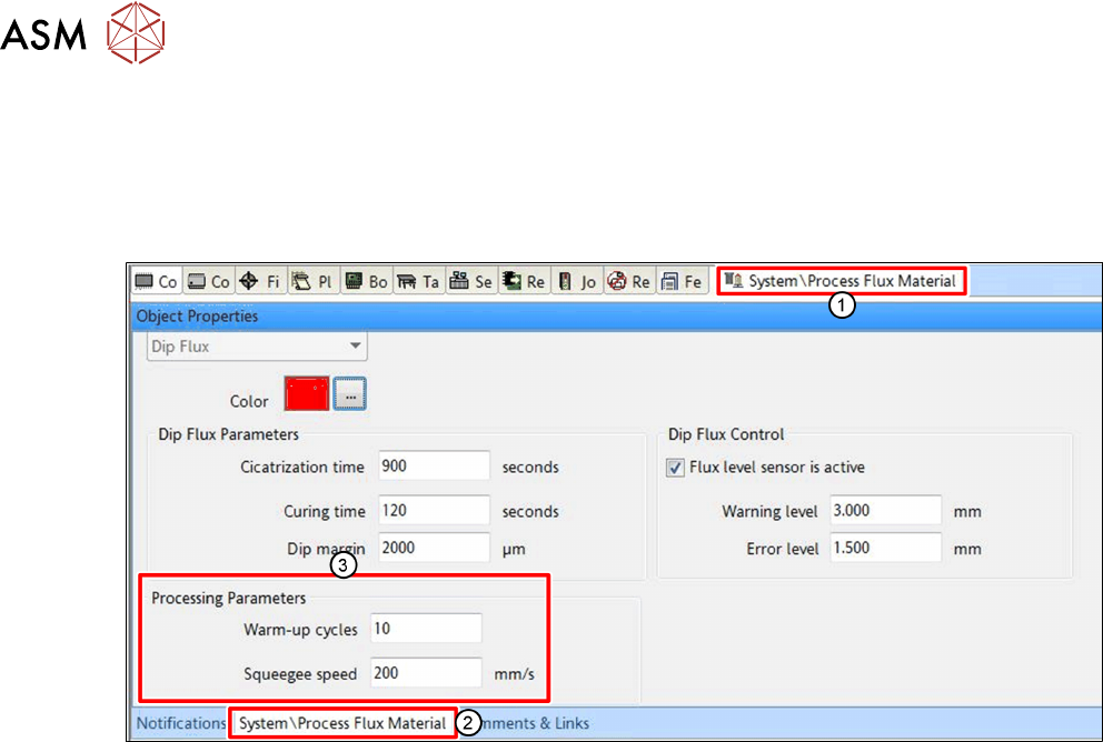► Klicken Sie in SIPLACE Pro auf die Registerkarte des entsprechenden Flussmittels(1).