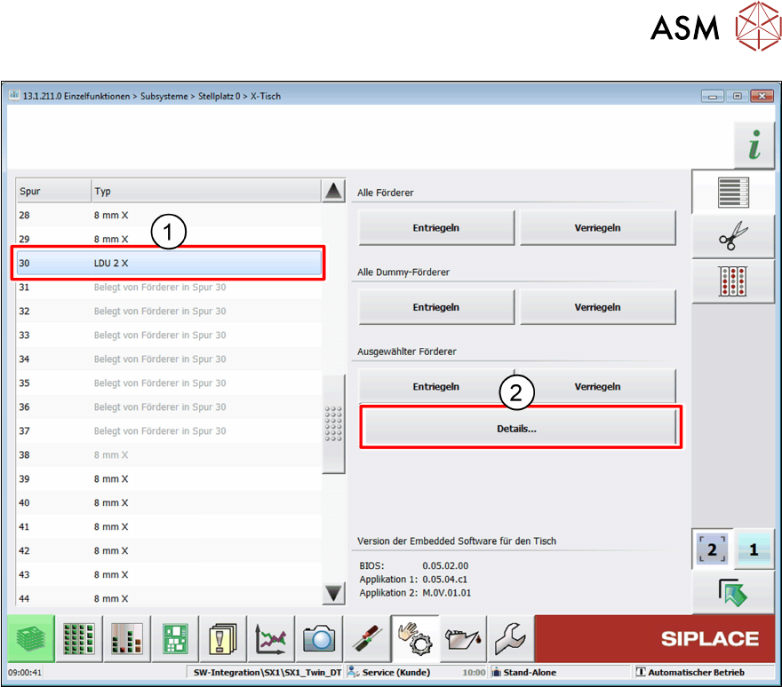 4 Bedienung 4.3 Null-Position der Dipping-Platte einstellen Bedienungsanleitung SIPLACE Linear Dipping Unit 2 X 05/2020 63 ► Wählen Sie die LDU aus der Liste (1) . ► Klicken Sie auf die Schaltfläche Details… (2) .