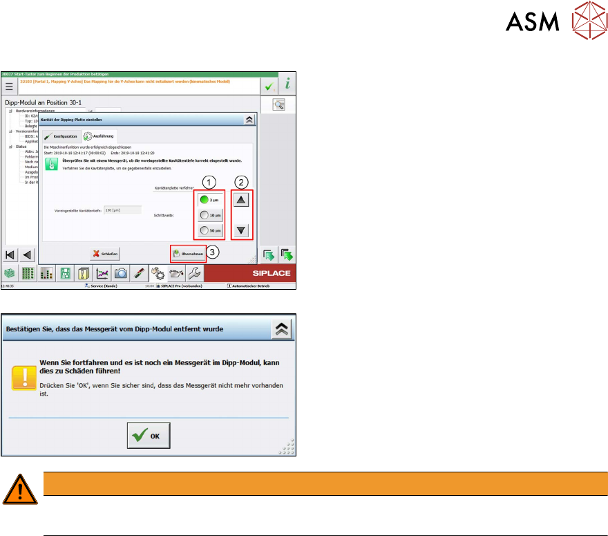 4 Bedienung 4.5 Schichtdicke des Flussmittels überprüfen 70 Bedienungsanleitung SIPLACE Linear Dipping Unit 2 X 05/2020 4.5 Schichtdicke des Flussmittels überprüfen HINWEIS Zielgruppe: Rüstungsbediener Das beschriebene V…