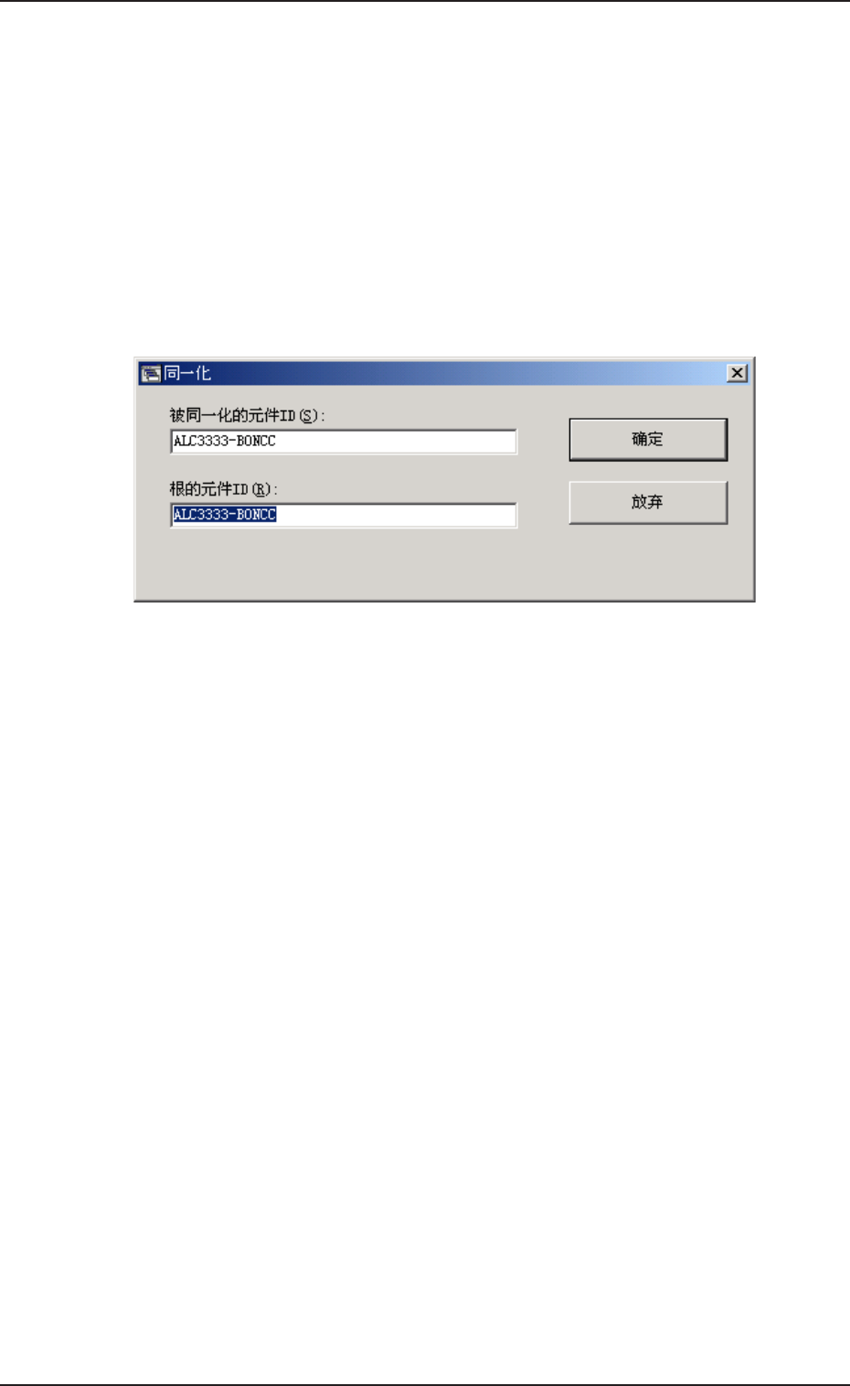 0308-001 3 - 10 (3) 在 “ 新的连接 ID ” 里,输入要建立的连接 ID 名,点击 [OK] 按 钮。 新的连接 ID 被创建了。 2.3.6 2.3.6 2.3.6 2.3.6 2.3.6 同一化 同一化 同一化 同一化 同一化 ( 1 ) 选择要同一化的元件 ID 。 选中的元件 ID 显示为蓝色。 (2) 单击 [ 同一化 ] 按钮。 显示 “ 同一化 ” 界面。 Fig.3C 1 0 Fig.3C 1 0 …