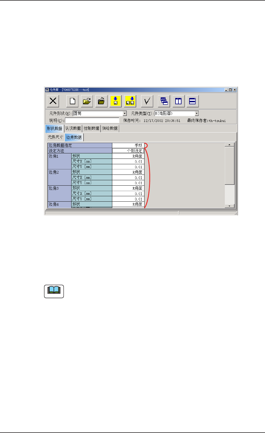 3.2.2 3.2.2 3.2.2 3.2.2 3.2.2 “ 边角数据 边角数据 边角数据 边角数据 边角数据 ” Tab Tab Tab Tab Tab 对应元件形状 “ 圆筒、方形、异形 ( 简单 ) ” 的选项卡。 • • • • • 页面显示 页面显示 页面显示 页面显示 页面显示 单击 “ 形状数据 ” 选项卡的 [ 边角数据 ]Tab ,显示以下选项卡。 • • • • • 页面构成 页面构成 页面构成 页面构成 页面构成…