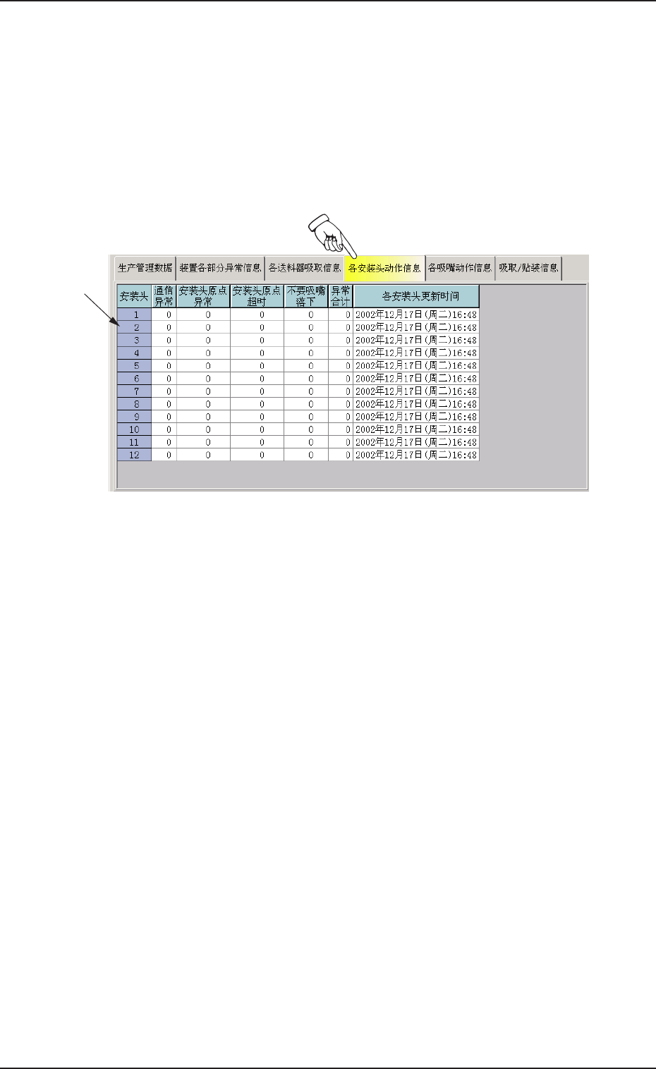 点击 “ 装置生产情况 ” 界面的[ 各安装头动作信息]Tab,显示如下