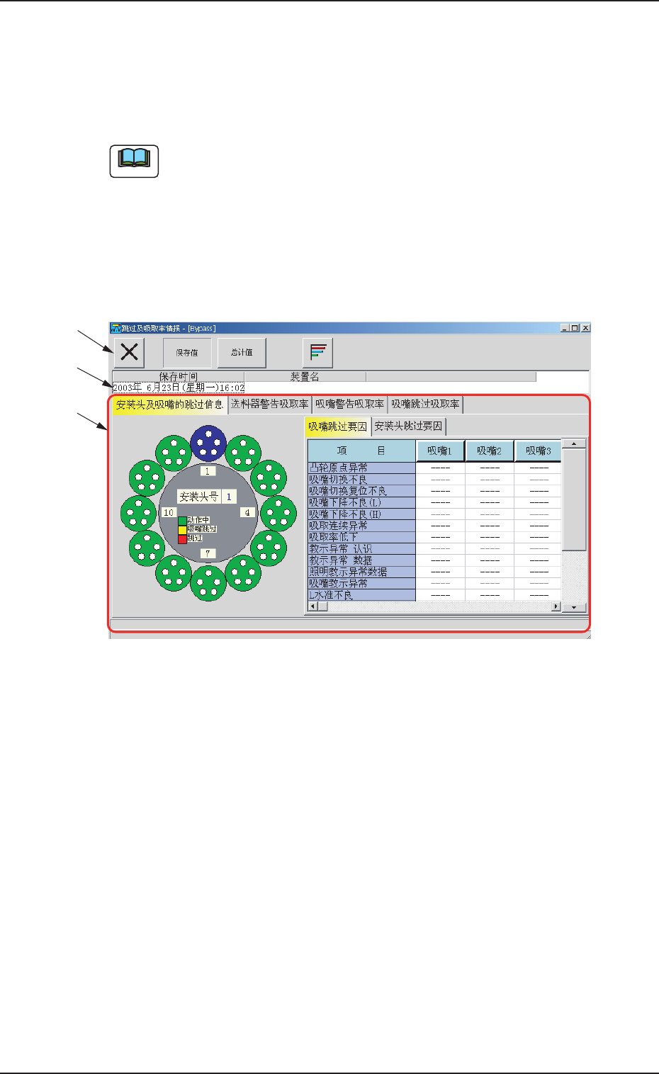 (15) (15) (15) (15) (15) 宽度 宽度 宽度 宽度 宽度 元件的宽度。 各显示项目标有按钮,单击按钮,该项目的数据按降序列 出。按异常的多少排列,有助于解析提高生产效率。 单击 [ 送料器编号 ] ,返回到初始显示 ( 送料器编号顺序 ) 。 *3 *3 *3 *3 *3 滚动条 滚动条 滚动条 滚动条 滚动条 当前选项卡上无空间显示的送料器编号,可点击下向箭头或 者上向箭头显示。 0308-001 4 - 38 …