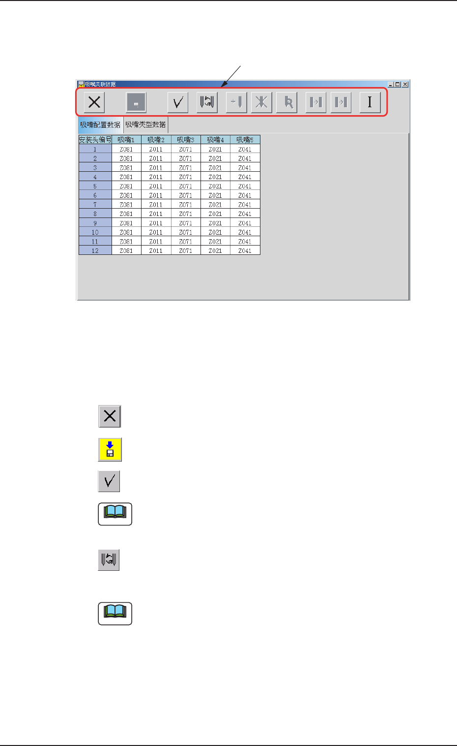 • • • • • “ 吸嘴关联数据 吸嘴关联数据 吸嘴关联数据 吸嘴关联数据 吸嘴关联数据 ” 界面构成 界面构成 界面构成 界面构成 界面构成 *1 *1 *1 *1 *1 功能图标 功能图标 功能图标 功能图标 功能图标 可进行以下多种操作。 : : : : : 关闭 “ 吸嘴关联数据 ” 界面。 : : : : : 保存输入的数据。 : : : : : 检查输入的数据。 检查数据发现错误时,出现错误信息提示框。 : : : : …