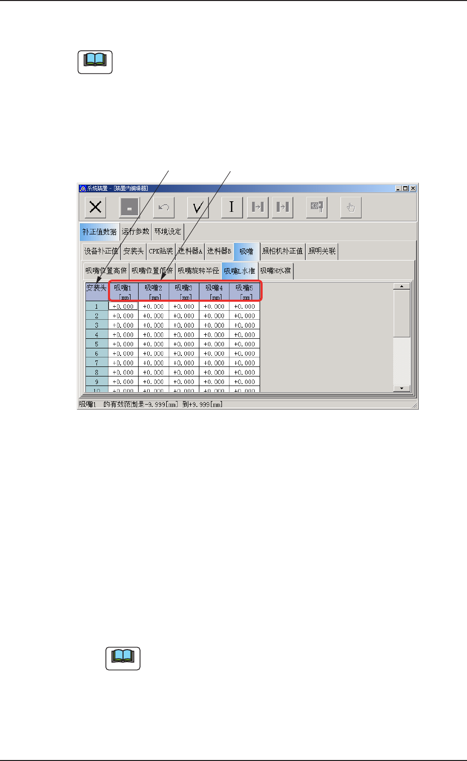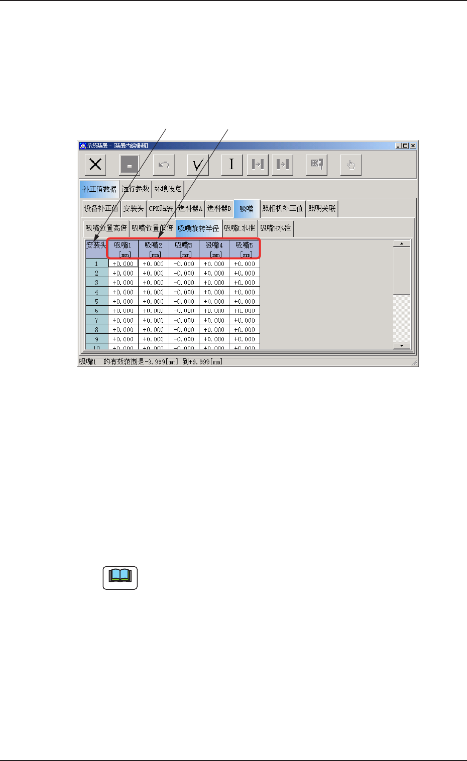 补正安装头旋转中心到各吸嘴距离( 旋转半径) 的补正值。