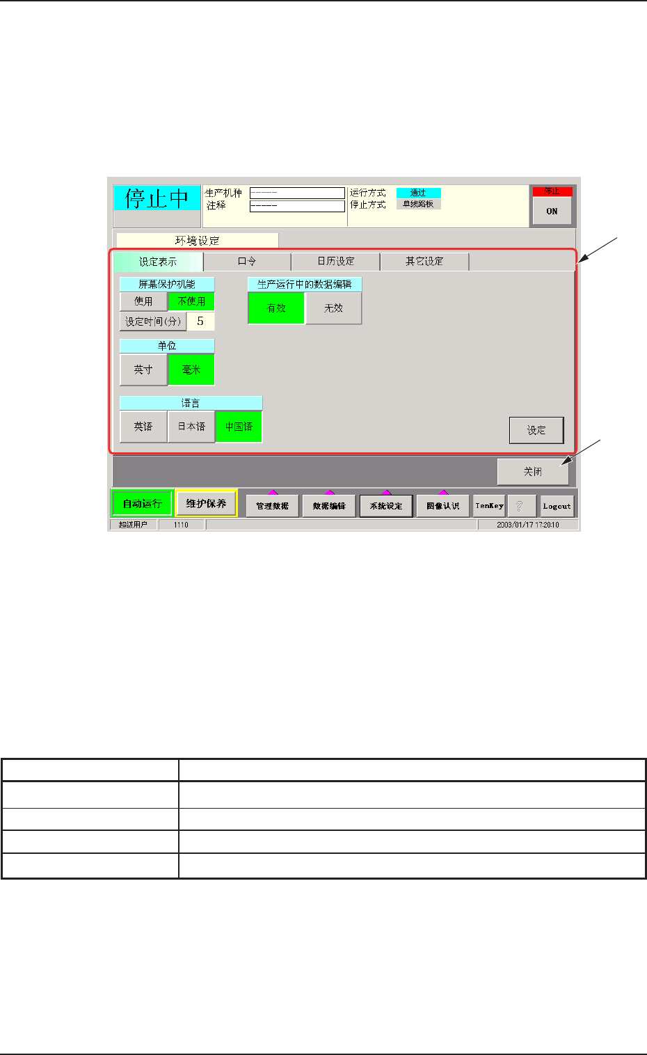 5. 1 5. 1 5. 1 5. 1 5. 1 “ 设定表示 设定表示 设定表示 设定表示 设定表示 ” Tab Tab Tab Tab Tab 可进行屏幕保护机能设定、单位切换、显示语言切换。 • • • • • 页面显示 页面显示 页面显示 页面显示 页面显示 显示 “ 环境设定 ” 界面时,单击 [ 设定表示 ]Tab ,显示以下选项 卡。 Fig.3E6 1 Fig.3E6 1 Fig.3E6 1 Fig.3E6 1 Fig.…