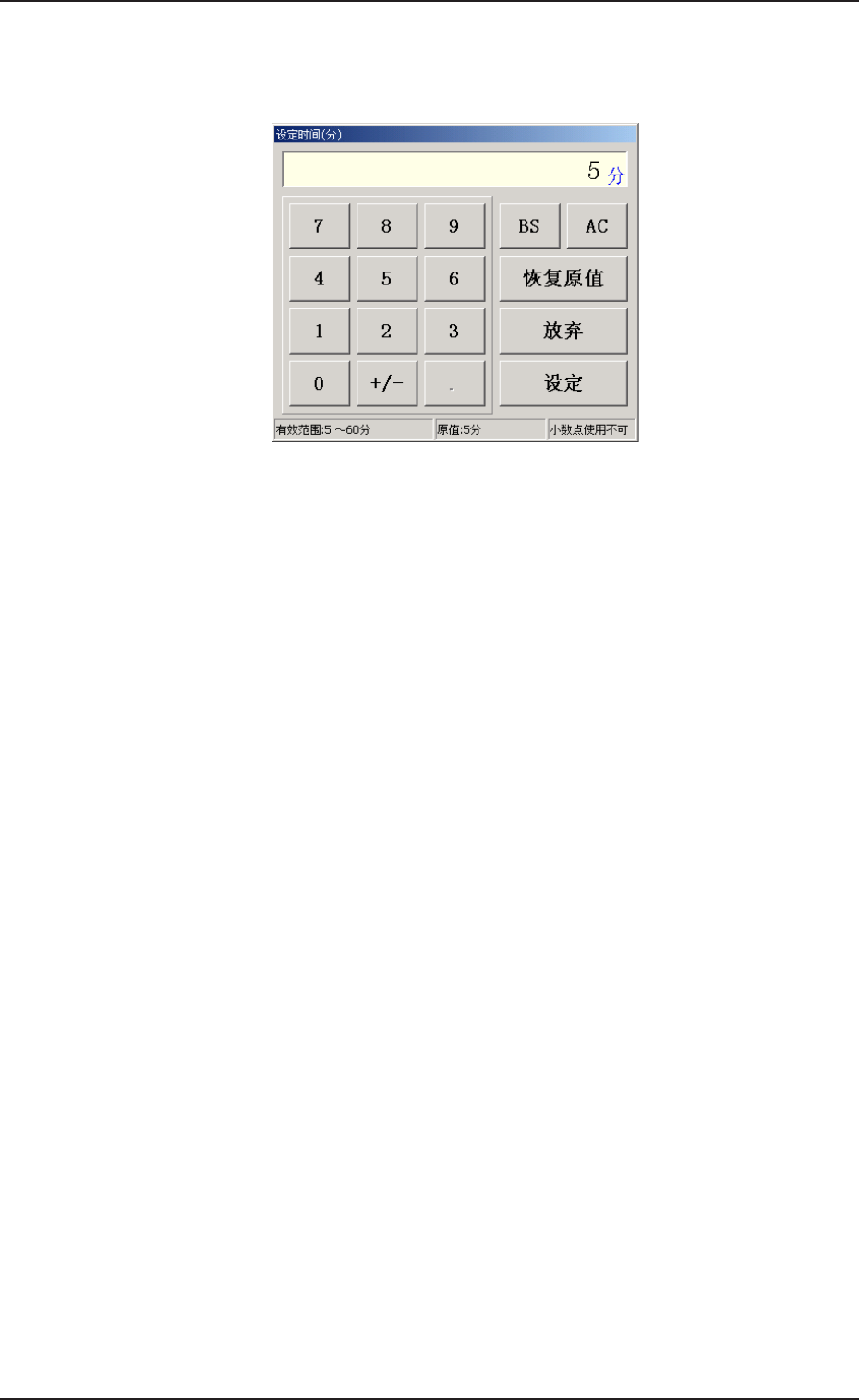 (2) 使用屏幕保护机能时, ([ 使用 ] 按钮变为绿色 ) ,单击 [ 设 定时间 ( 分 )] 按钮,显示以下 “ 设定时间 ( 分 ) ” 编辑界面。 Fig.3E62 Fig.3E62 Fig.3E62 Fig.3E62 Fig.3E62 “ 设定时间 设定时间 设定时间 设定时间 设定时间 ( ( ( ( ( 分 分 分 分 分 ) ) ) ) ) ” 编辑界面 编辑界面 编辑界面 编辑界面 编辑界面 输入启动屏幕保护机能之…
