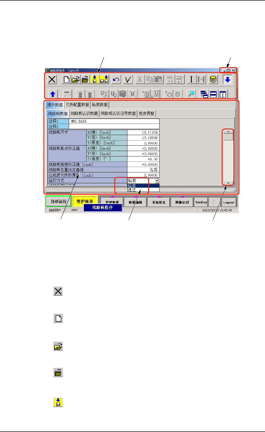 对 “ 线路板程序 ” 编辑界面的构成、工具栏及图标进行说明。