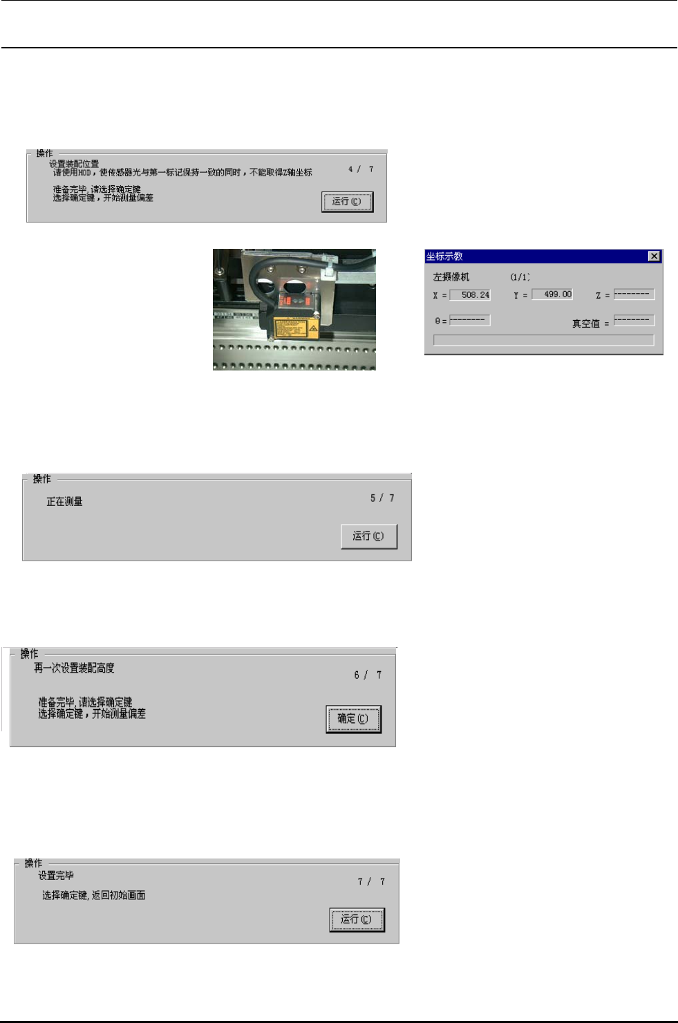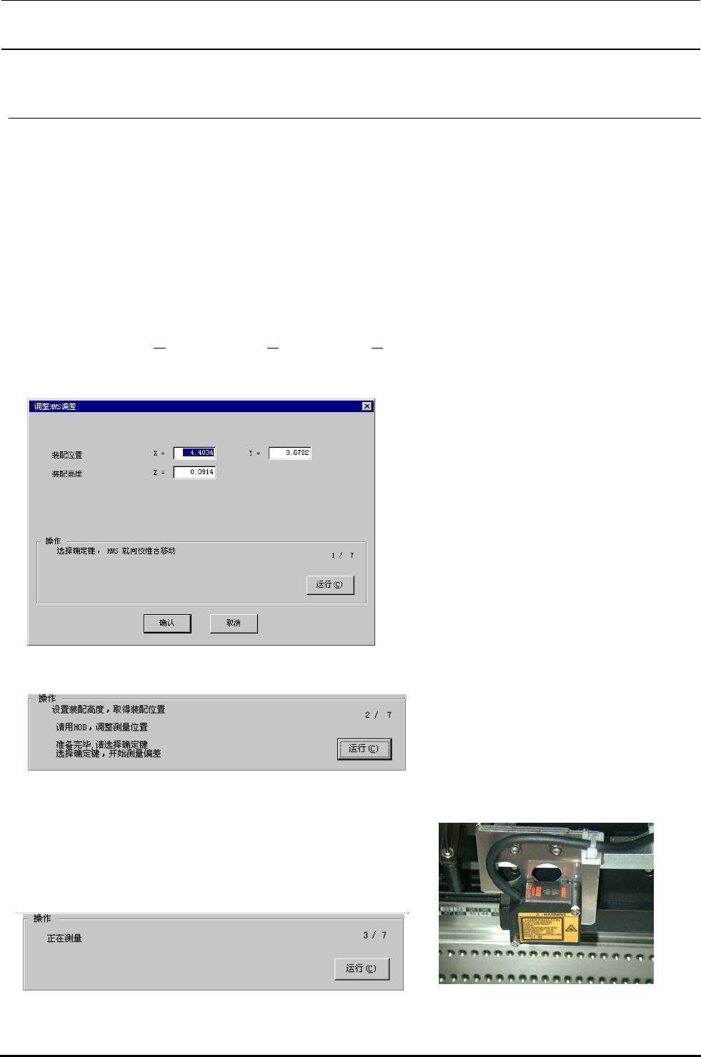 Rev.2.00 MS 参数 4-24 4-4.3. 调整 HMS( 高度测定装置 : 选购品 ) 偏差 4-4-3-1. 功能 用 HMS 的 OCC 的组装位置,取得组装高度 。 4-4-3-2. 使用夹具 本设定不使用夹具 。 4-4-3-3. 操作 选择了 [ 偏差设定 (O )][ 贴装头偏差 (H )][HMS 偏差 (H )...] 之后,显示出下面的调整 HMS 偏差的设定画 面 。 < 操作 ・1/ 7 > 准备完毕,…