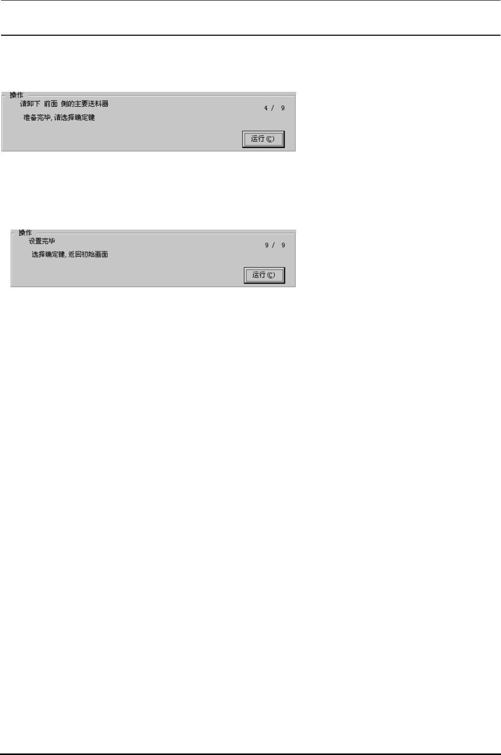 Rev.2.00 MS 参数 4-66 < 操作 ・4/9> 从前面卸下主供料器 。 准备完毕,请选择确认 。 选择了确认之后, 设定前侧的下一个位 置 。 结束了最终位置的设定之后,用其平均值计算前侧吸附基准位置偏差值 。 前侧结束之后,便进行后侧的吸附基准位置的设定 。 设定方法同前侧一样 。 < 操作 ・9/9> 设定完毕 。 选择了确认之后,返回到初期设定画面 。