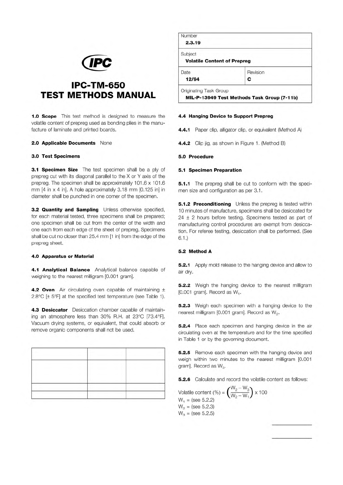 Figure 1 Method of holding device IPC-TM-650 Number Subject Date Revision Page 2 of 3 2.3.19 Volatile Content of Prepreg 12/94 C 21 6 cm (8 5 inj minimum TOP VIEW 5.3 Method B 5.3.1 Apply mold release to the alligator cl…