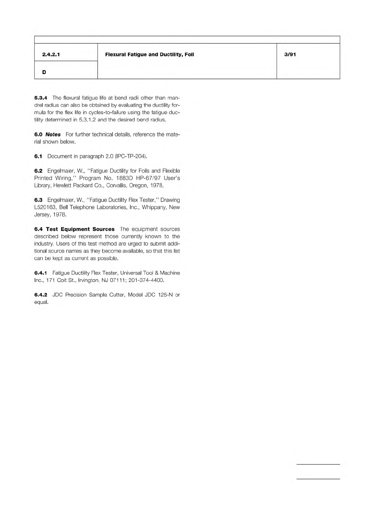 IPC-TM-650 Number Subject Date Revision Page 3 of 3 2.4.2.1 Flexural Fatigue and Ductility, Foil 3/91 D 5.3.4 The flexural fatigue life at bend radii other than man¬ drel radius can also be obtained by evaluating the duc…