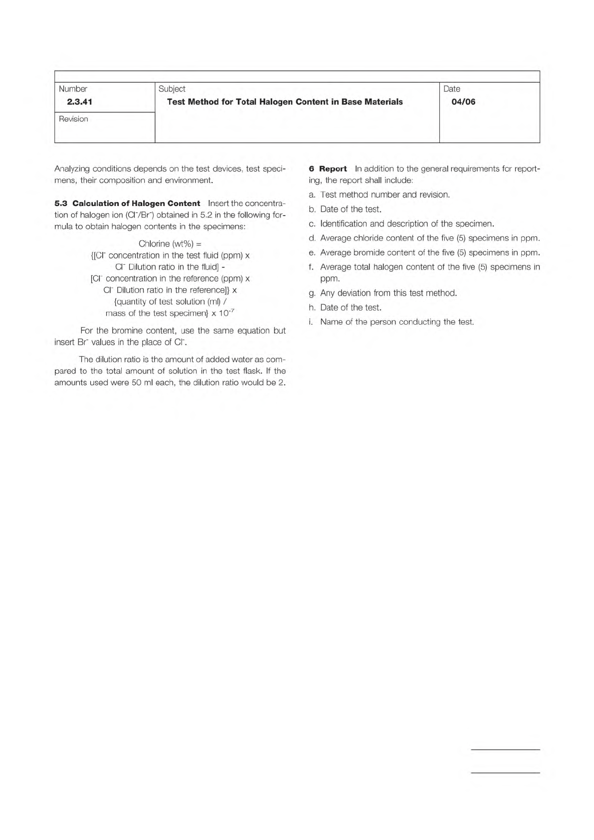 Note: Note: IPC-TM-650 Page 3 of 3 Number 2.3.41 Revision Subject Test Method for Total Halogen Content in Base Materials Date 04/06 Analyzing conditions depends on the test devices, test speci¬ mens, their composition a…