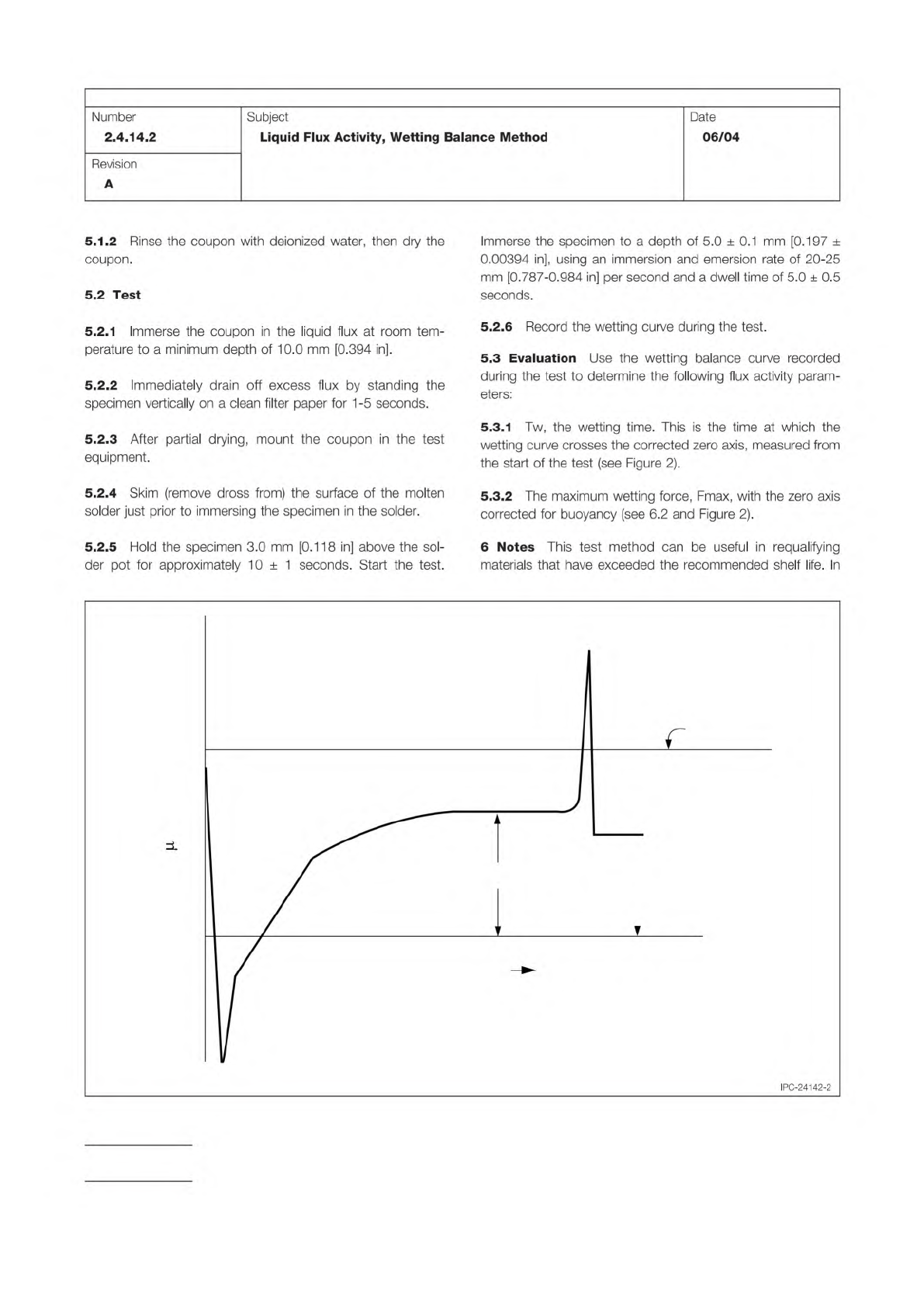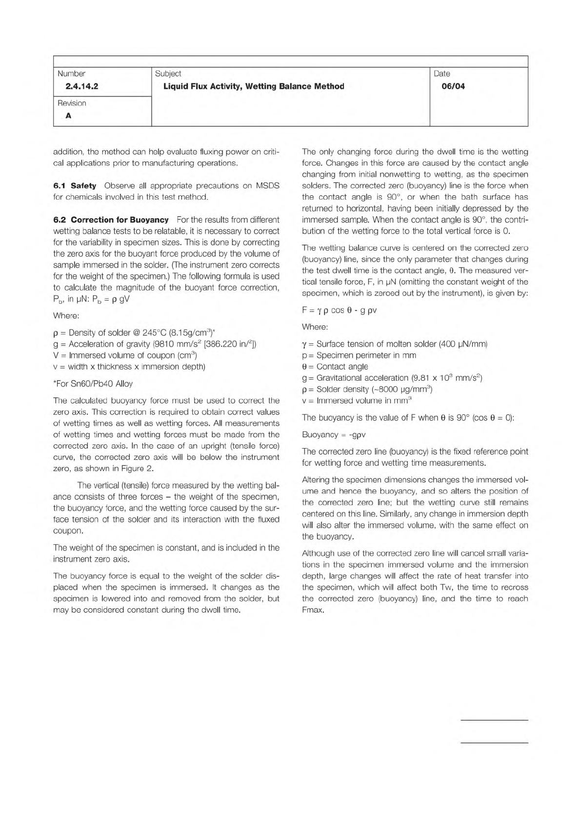 Figure 2 Wett ing Balance C urve TIME FORCE ( N) 0 Instrument Zero Corrected Zero Fmax T w IPC-TM-650 Page 2 of 3 Number 2.4.14.2 Revision A Subject Liquid Flux Activity, Wetting Balance Method Date 06/04 5.1.2 Rinse the…