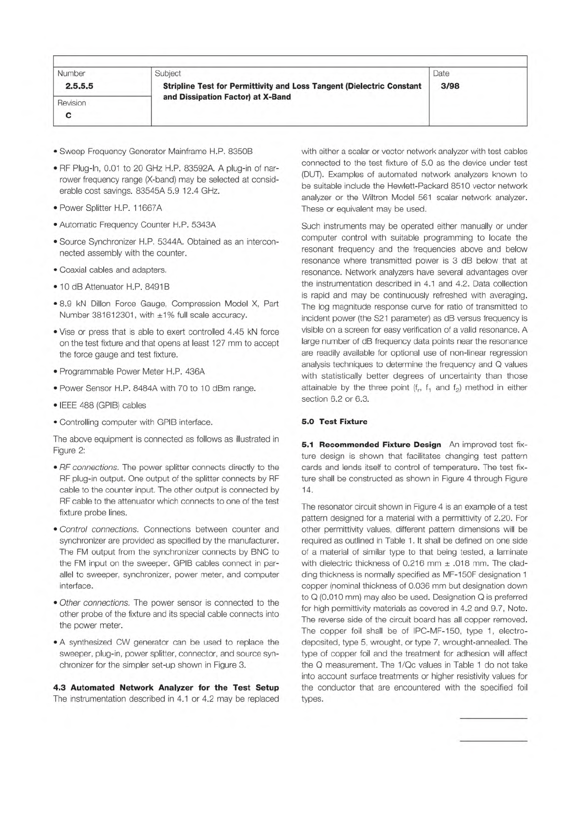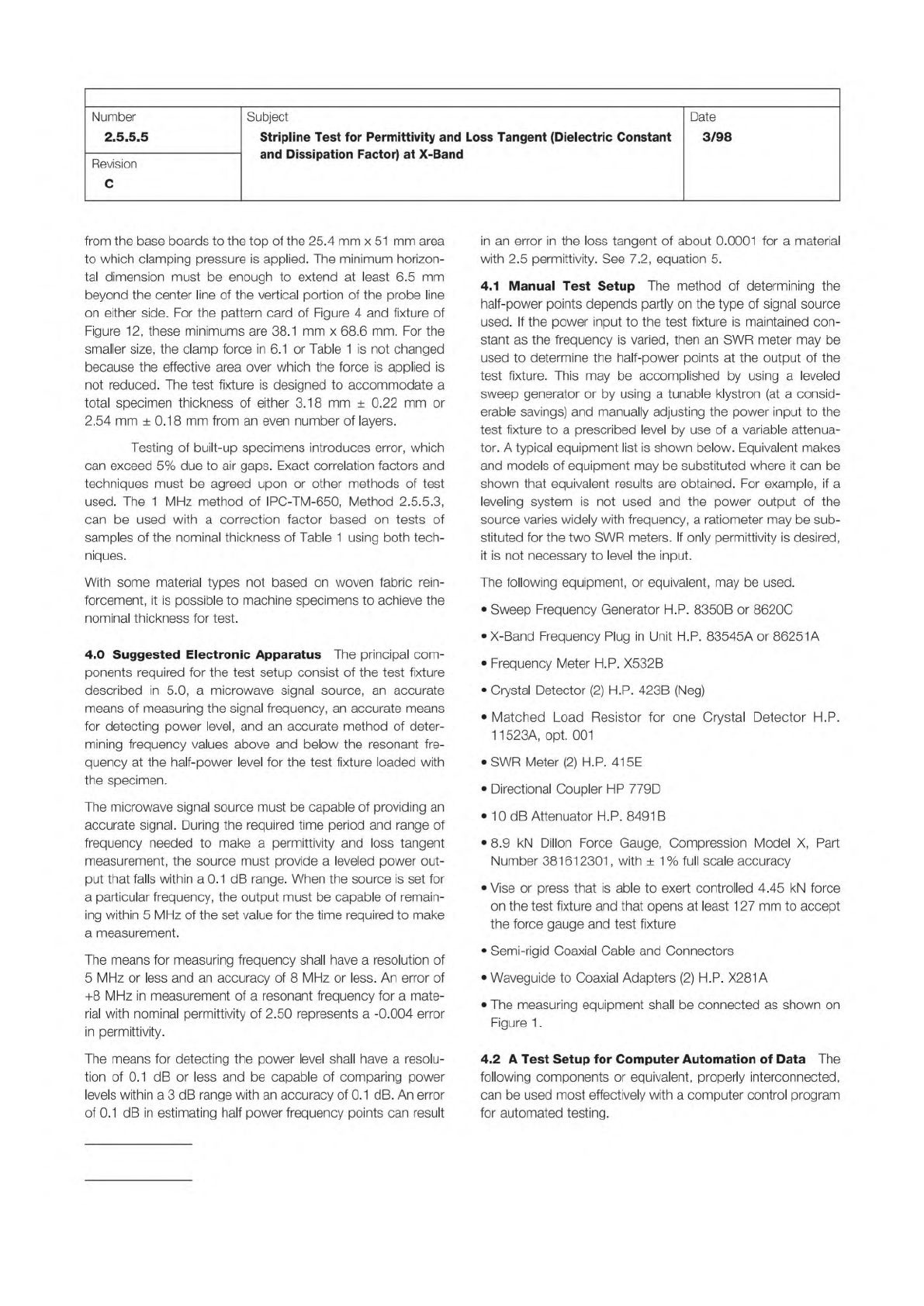 IPC-TM-650 Page 3 of 25 Number 2.5.5.5 Subject Stripline Test for Permittivity and Loss Tangent (Dielectric Constant and Dissipation Factor) at X-Band Date 3/98 Revision C • Sweep Frequency Generator Mainframe HP. 8350B …