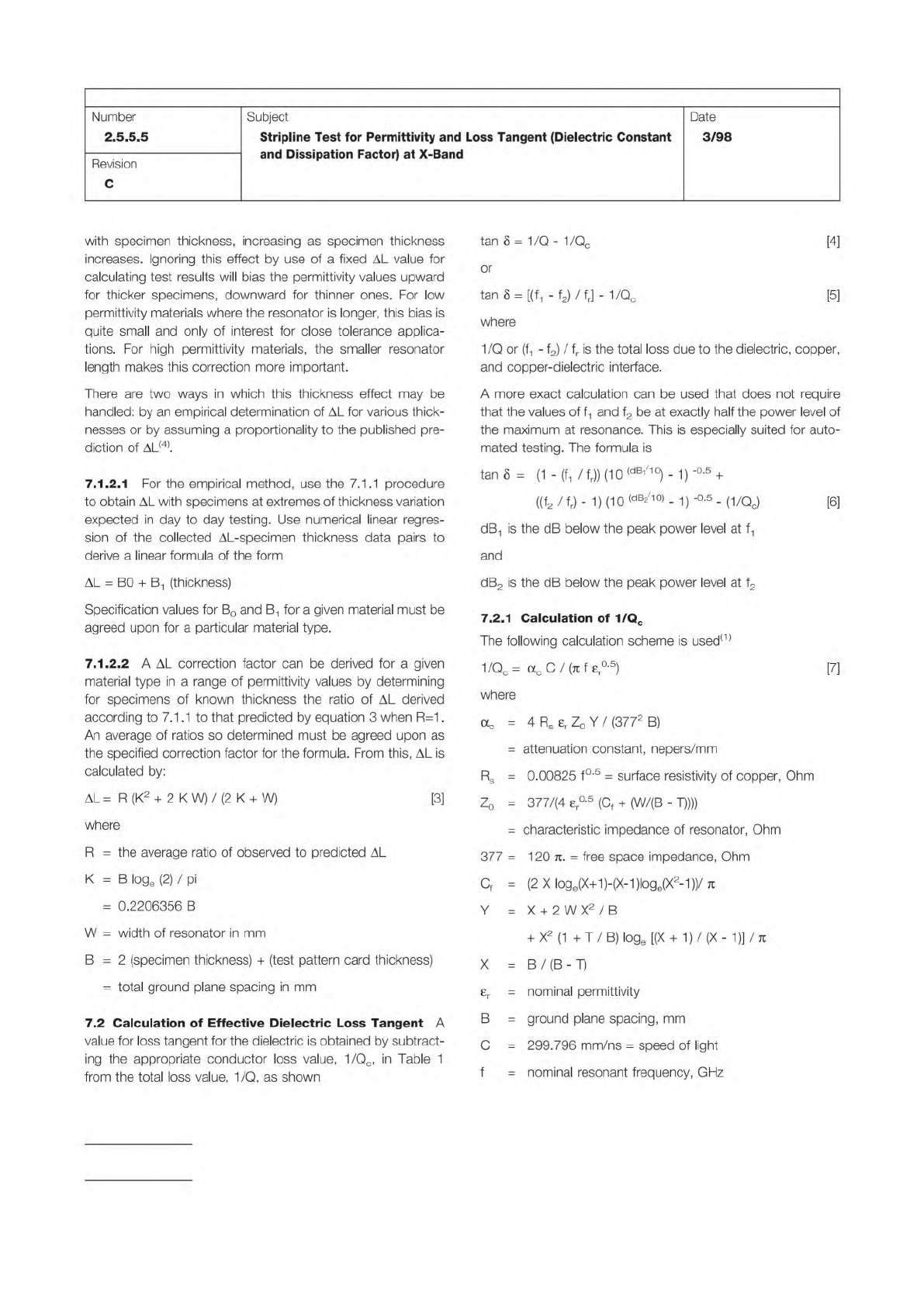 z z z z IPC-TM-650 Page 7 of 25 Number 2.5.5.5 Subject Stripline Test for Permittivity and Loss Tangent (Dielectric Constant and Dissipation Factor) at X-Band Date 3/98 Revision C Cartesian screen display shows the S21 p…