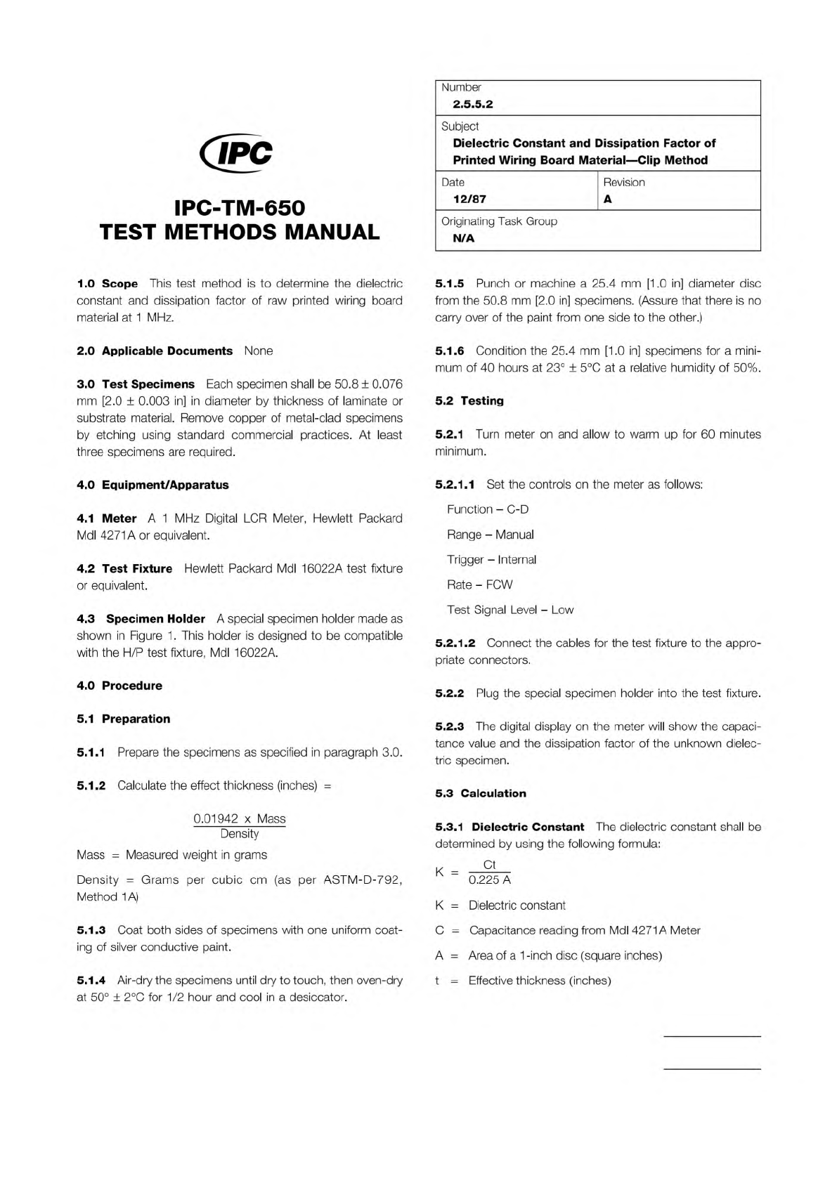 The Institute for Int erconnecting and Packaging E lectronic Circuits 2215 Sanders Road • Northbrook, IL 60062 Material in this T est M ethods Manual was vol untaril y establis hed by T echni cal Committees of the IP C. …