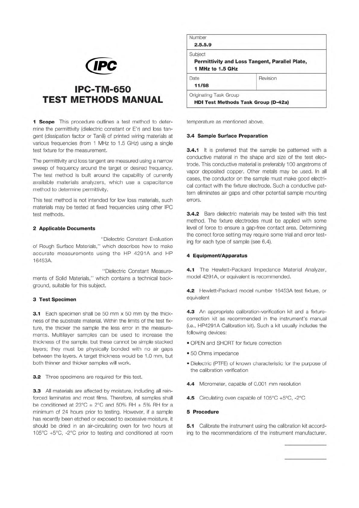 HP 4291A-5 Product N ote HP Application Note 380-1 The Institute for Int erconnecting and Packaging E lectronic Circuits 2215 Sanders Road • Northbrook, IL 60062 Material in this T est M ethods Manual was voluntarily est…