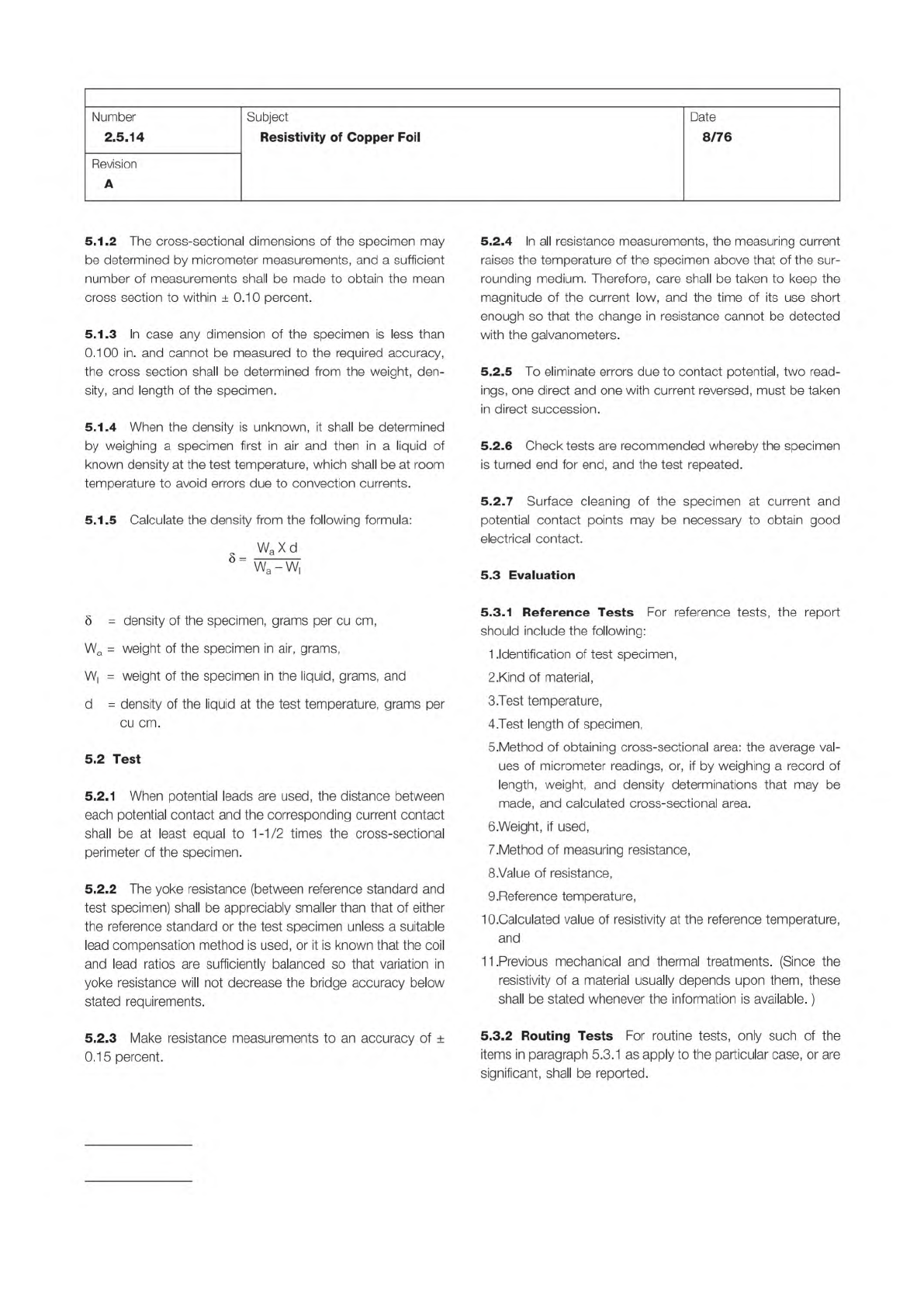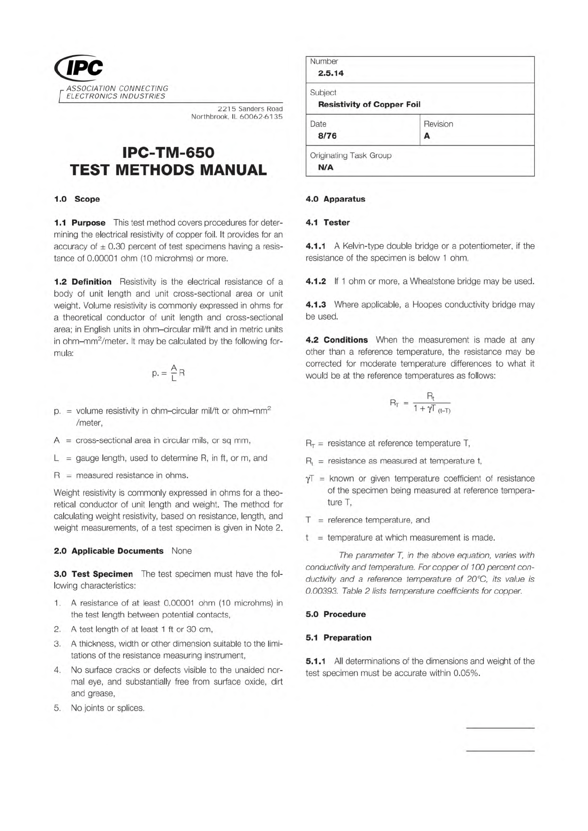 where: IPC-TM-650 Page 2 of 3 Number 2.5.14 Subject Resistivity of Copper Foil Date 8/76 Revision A 5.1.2 The cross-sectional dimensions of the specimen may be determined by micrometer measurements, and a sufficient numb…