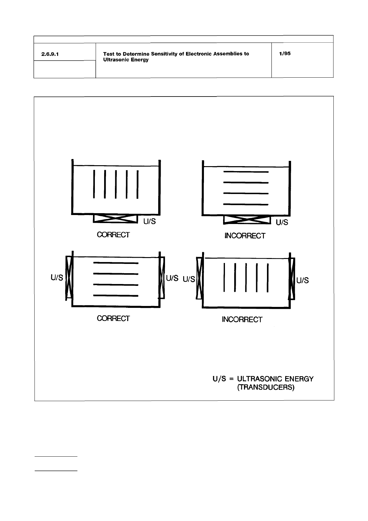Figure 1 IPC-TM-650 Number Subject Date Revision Page 4 of 5 2.6.9.1 Test to Determine Sensitivity of Electronic Assemblies to Ultrasonic Energy 1/95 INCORRECT CORRECT INCORRECT U/S = ULTRASONIC ENERGY (TRANSDUCERS)