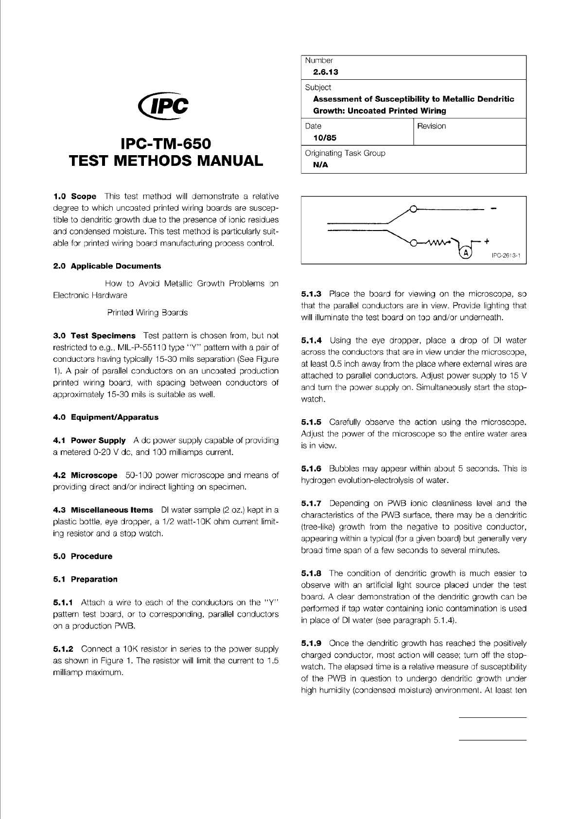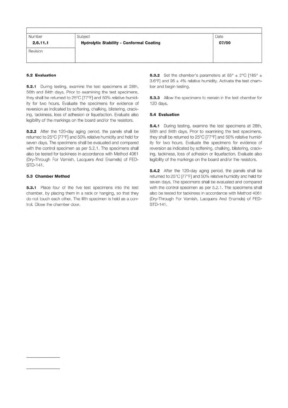 IPC-TM-650 Page 2 of 2 Number 2.6.11.1 Revision Subject Hydrolytic Stability - Conformal Coating Date 07/00 5.2 Evaluation 5.2.1 During testing, examine the test specimens at 28th, 56th and 84th days. Prior to examining …