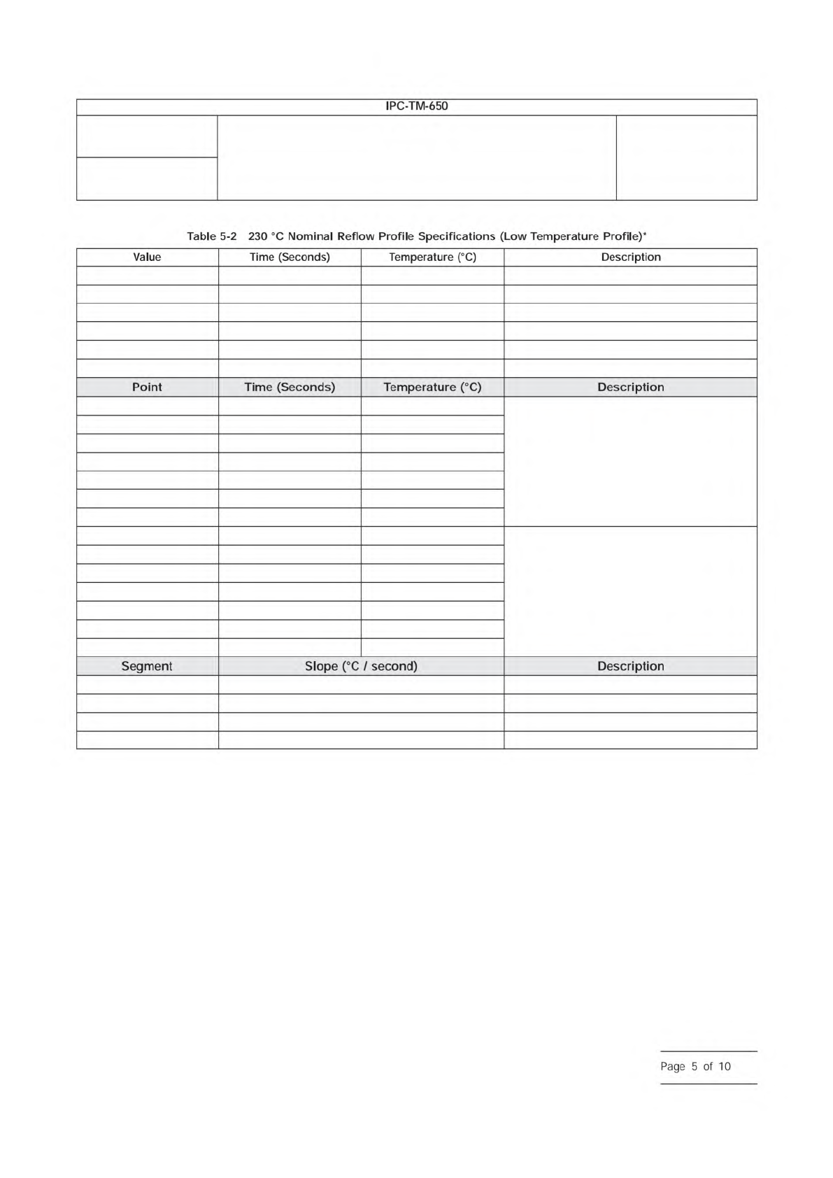 IPC-2627-5-2 Number 2.6.27 Subject Thermal Stress, Convection Reflow Assembly Simula tion Date 2/2020 Revision B 230 Reflow Profile Specifications Figure 5-2 230 Nominal Reflow Profile Chart (Low Temperature Profile)* IP…