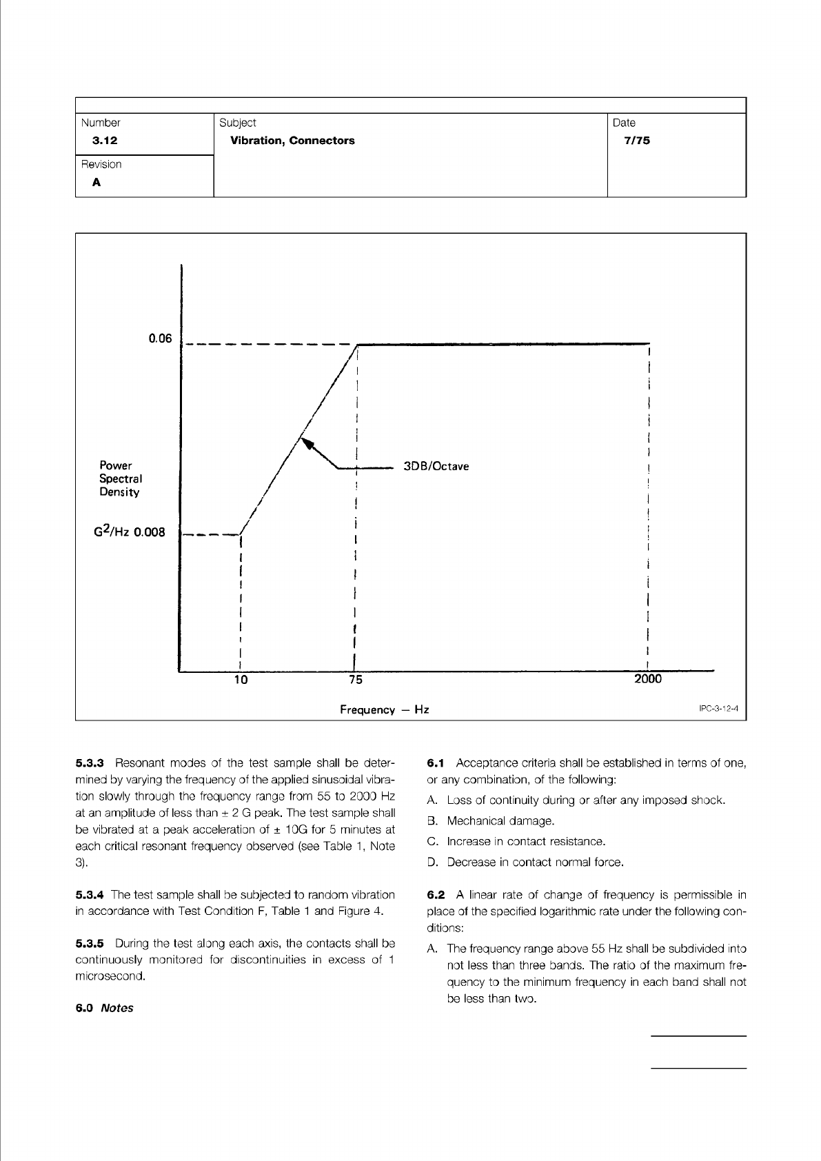 Figure 4 Random Vibration Input IPC-TM-650 Page 5 of 6 Number 3.12 Subject Vibration, Connectors Date 7/75 Revision A 0.06 Power Spectral Density G2/Hz 0.008 /1 ' / > > 3DB/Octave | / | । / , ! ( ; 1 : i ; 1 i…