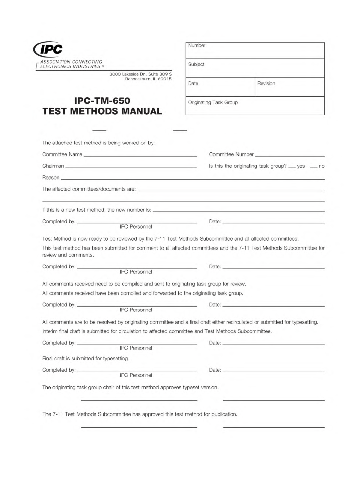 New T est Metho d Revision to Current T est M ethod 1. 2. 3. 4. 5a. APPROVED BY : Originating T ask Group Chair Date: 5b. APPROVED BY : T est Methods Subcommittee Chairman Date: Number ASSOCIATION CONNECTING / ELECTRONIC…