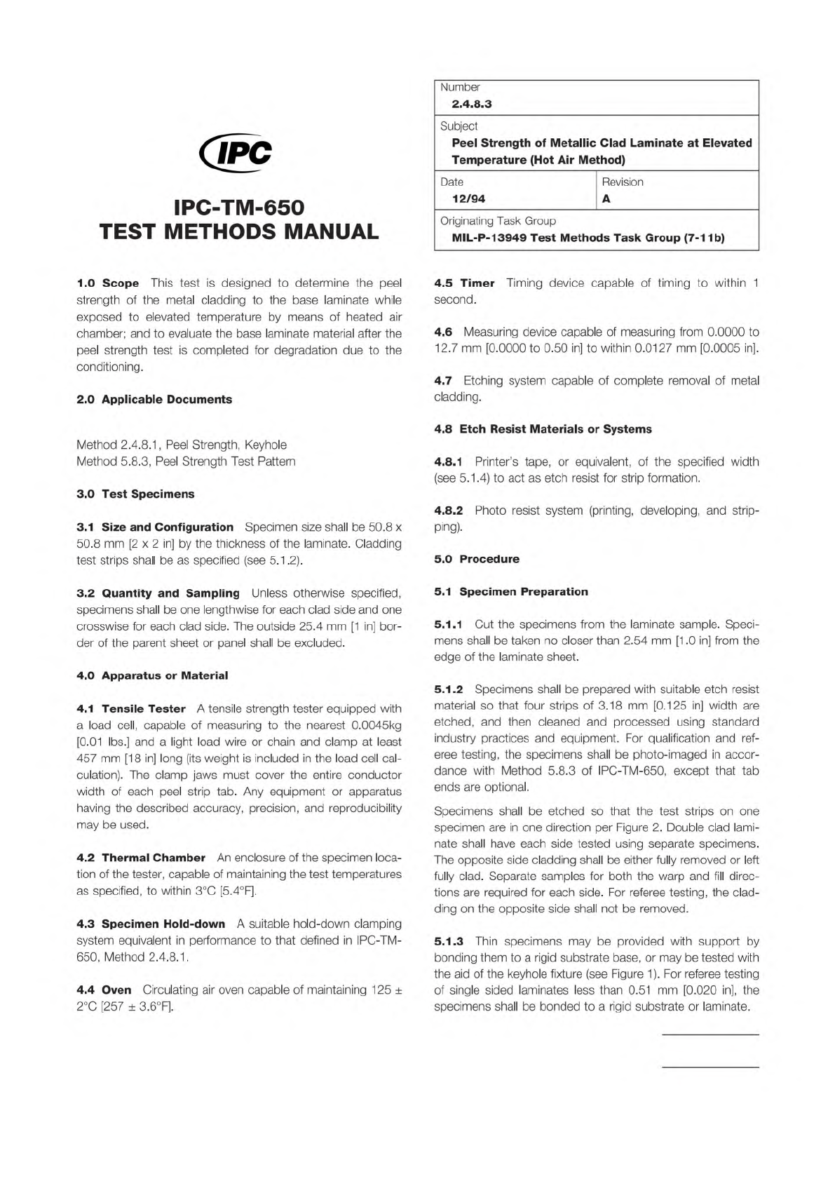 IPC-TM-650 Number Subject Date Revision Page 3 of 3 2.4.8.2 Peel Strength of Metallic Clad Laminates at Elevated Temperature (Hot Fluid Method) 12/94 A 5.3.3 Report any presence of laminate degradation as observed in 5.2…