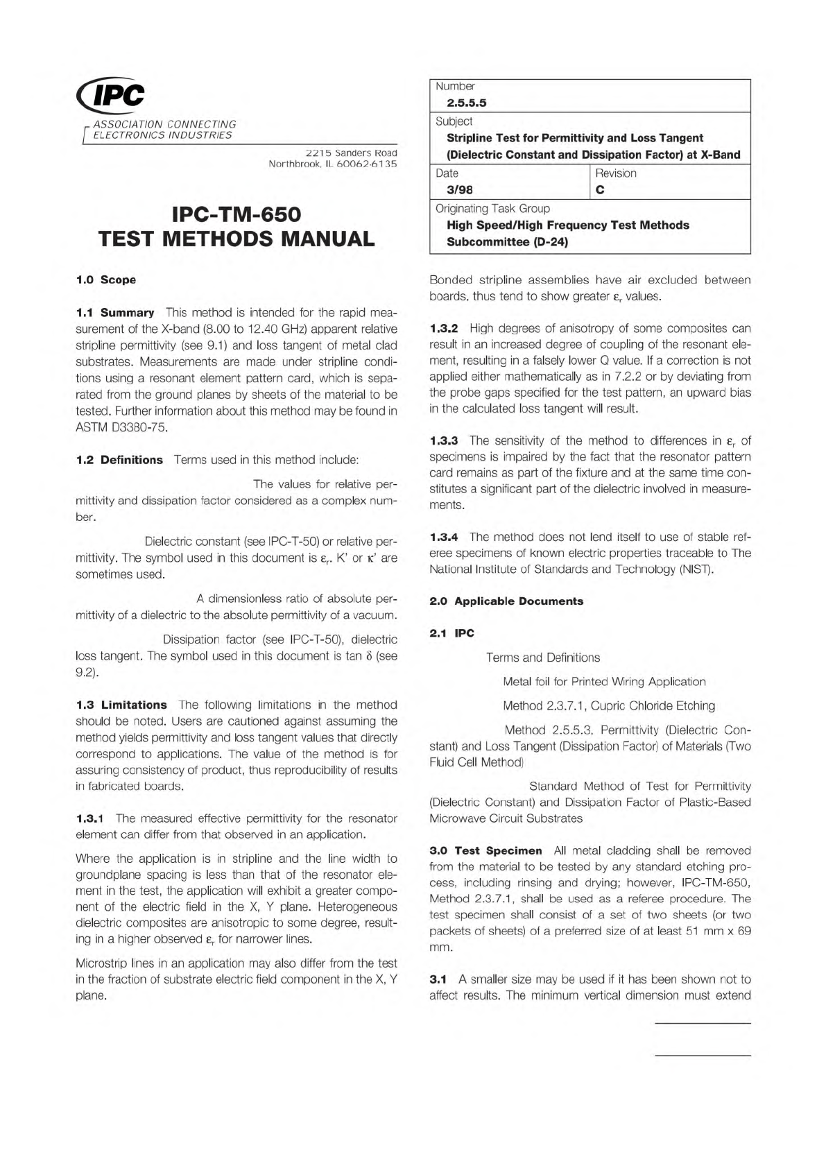 Complex Relative Permittivity Permittivity Relative Permittivity Loss T angent IPC-T -50 IPC-MF-150 IPC-TM-650 IPC -TM -65 0 ASTM D3380-75 Material in this T est M ethods Manual was voluntarily establis hed by T echni ca…
