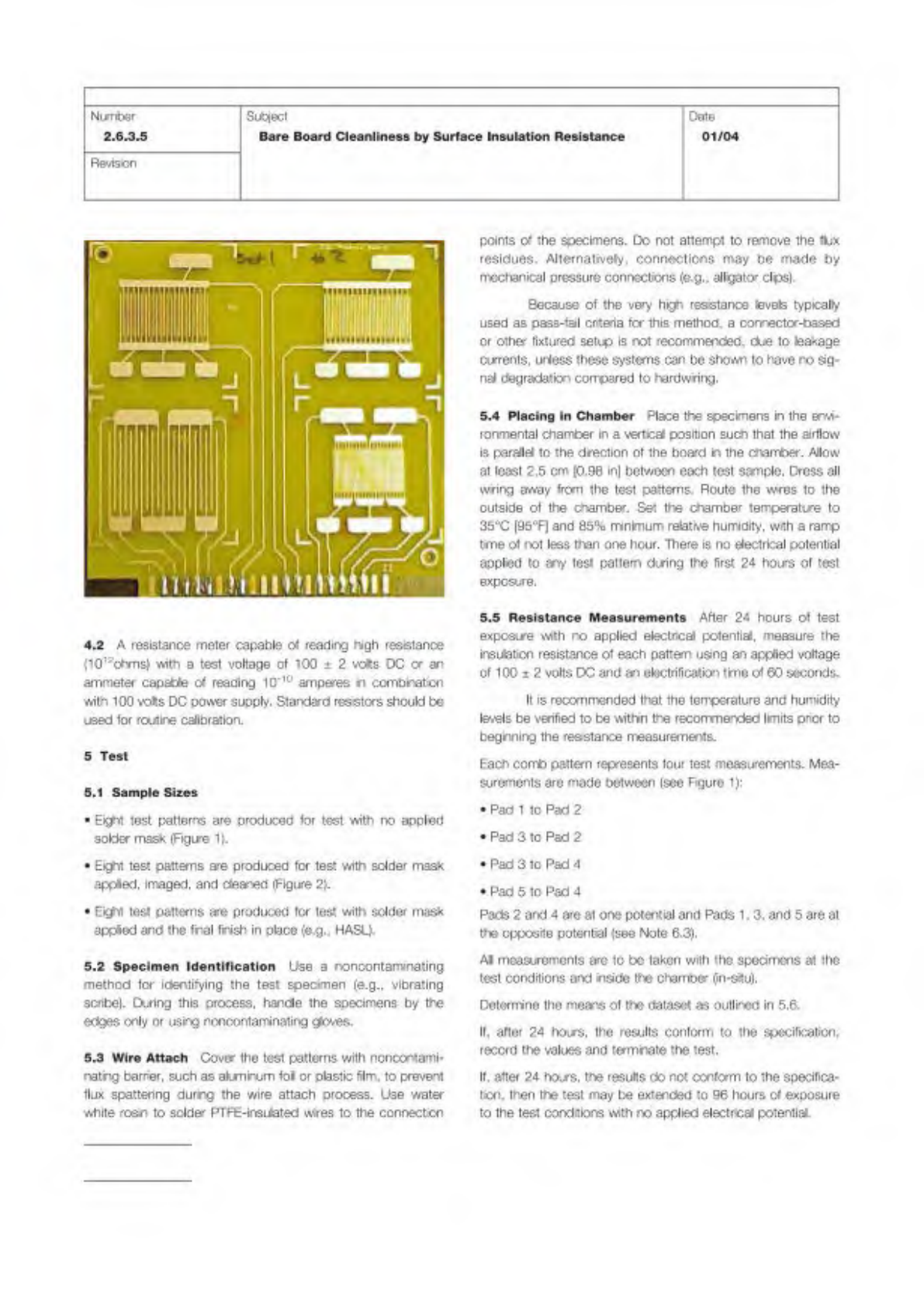 IPC-TM-650 Page 3 of 4 Number 2.6.3.5 Subject Bare Board Cleanliness by Surface Insulation Resistance Date 01/04 Revision After 96 hours total, repeat the measurement series. Regard¬ less of the outcome of the measuremen…