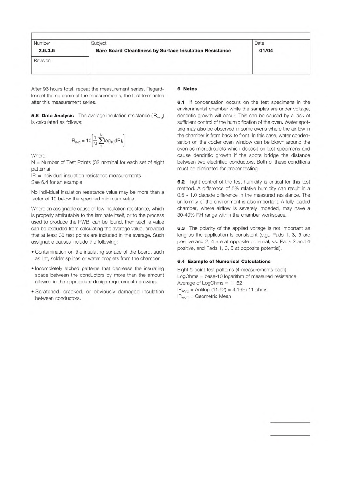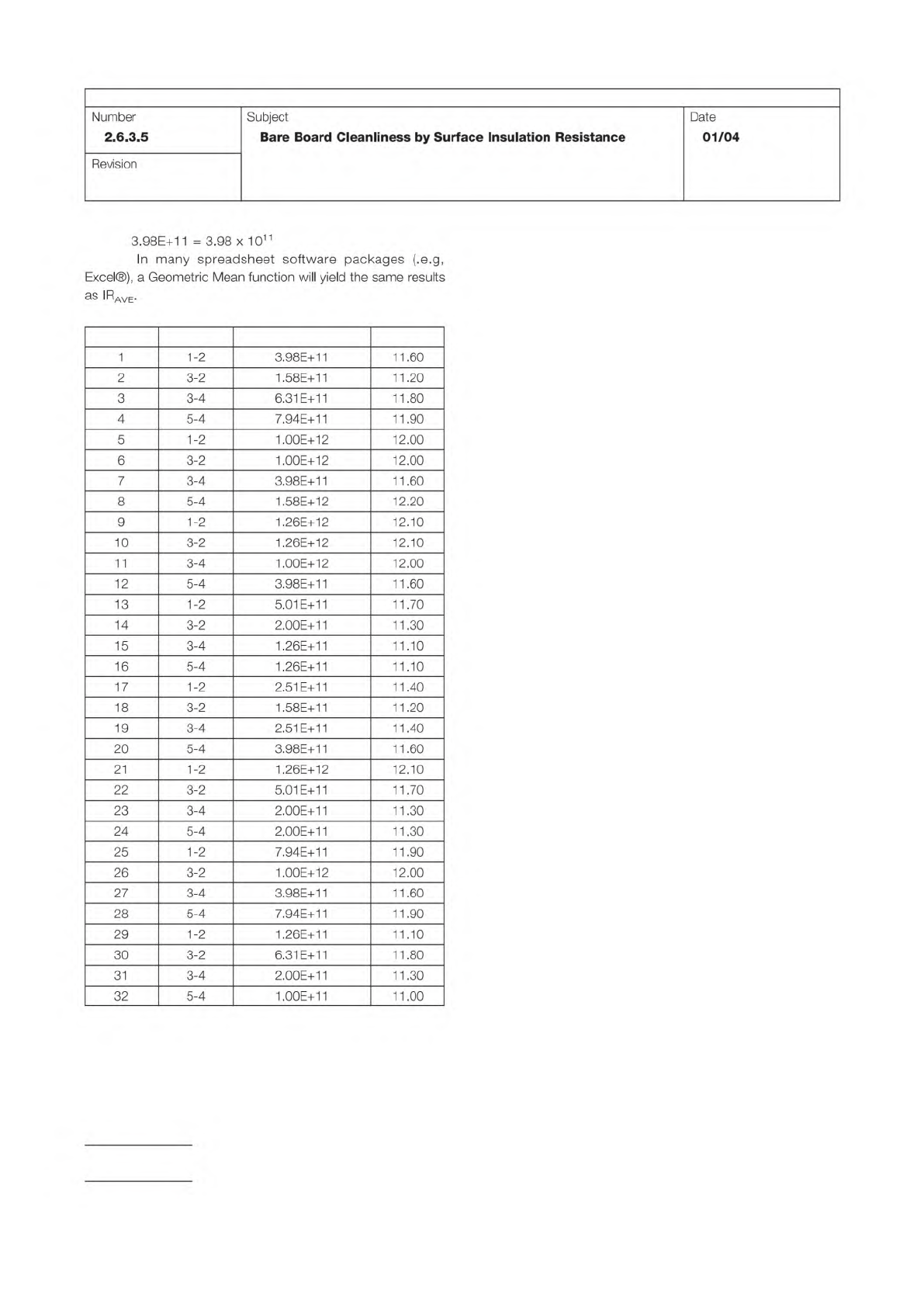 NOTE: NO T E : No. Pattern Resistance (Ohms) Lo gOhms IPC-TM-650 Page 4 of 4 Number 2.6.3.5 Subject Bare Board Cleanliness by Surface Insulation Resistance Date 01/04 Revision 3.98E+11 = 3.98 x 1011 In many spreadsheet s…
