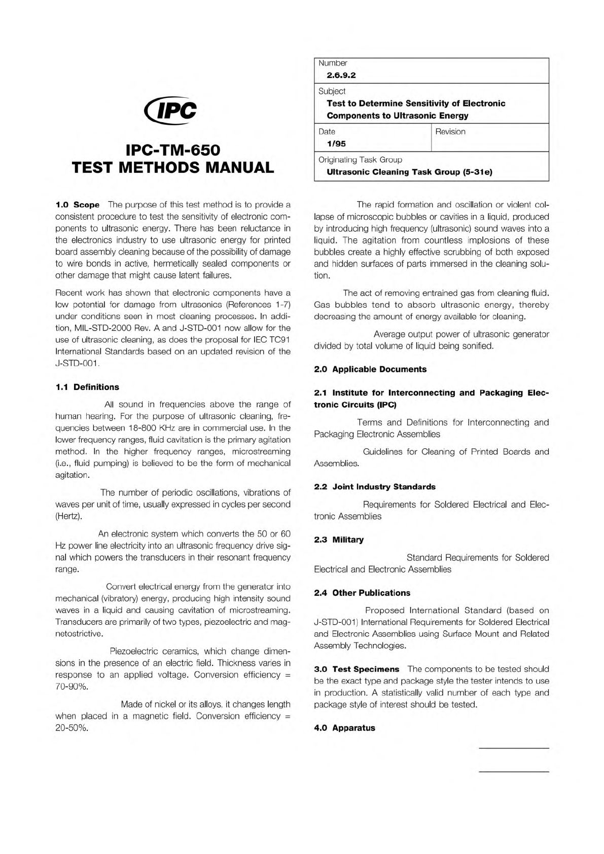 Ul tr aso un d: Frequency: Generator: T ransducers: Piezoelectri c: Magnetostrictive: Cavitation: Degas: Power Dens ity: IP C- T -5 0 IPC-CH-65 J-STD-001 MIL-STD-2000 Rev . A IE C - TC - 9 1 The Institute for Int erconne…
