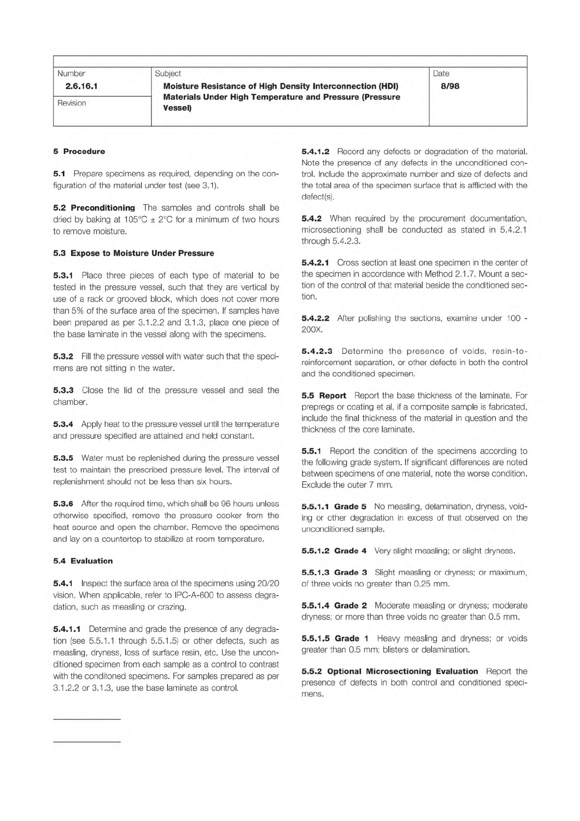 IPC-TM-650 Page 2 of 2 Number 2.6.16.1 Revision Subject Moisture Resistance of High Density Interconnection (HDI) Materials Under High Temperature and Pressure (Pressure Vessel) Date 8/98 5 Procedure 5.1 Prepare specimen…