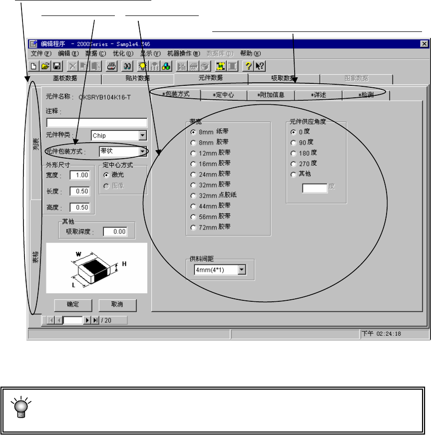 元件数据的制作画面(元件表)包含初始画面在内,共由5个画面(“包装方式”、“定心”、