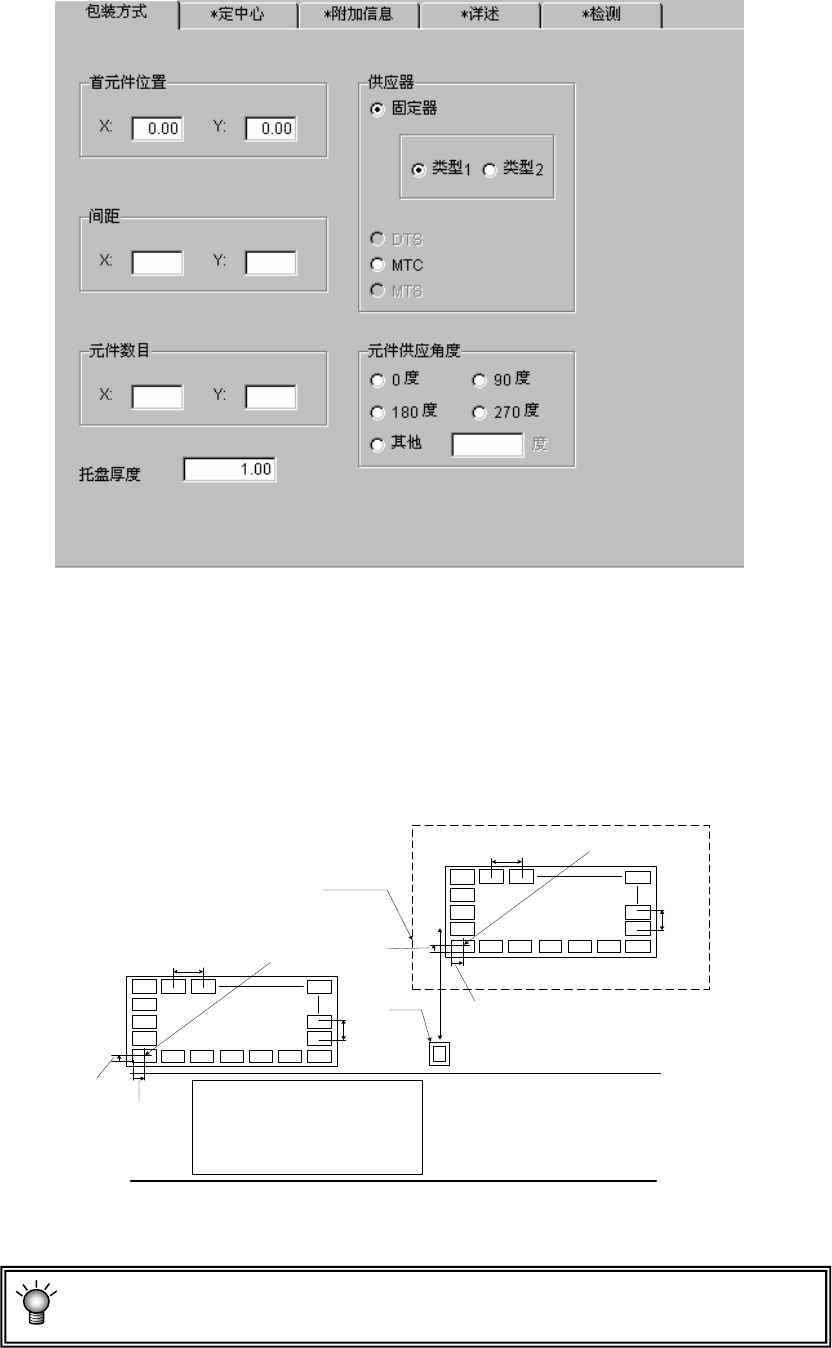 用从托盘外形开始的距离输入盘元件前头元件的中心位置(X、Y)。