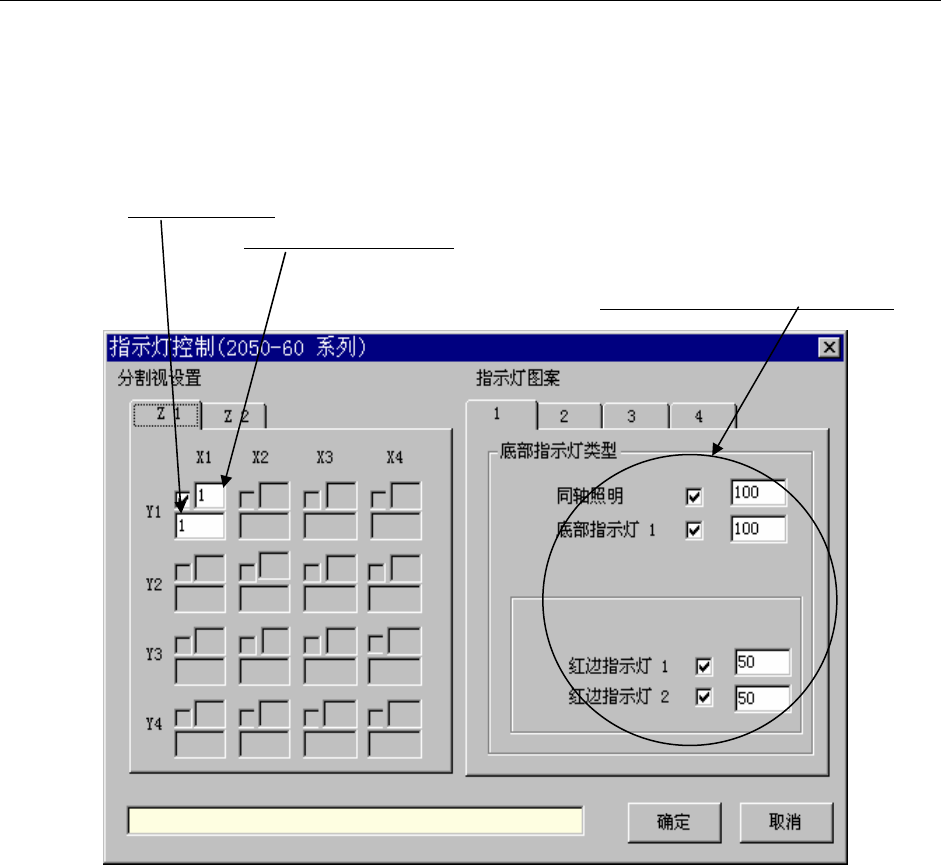 第 4 章 生产程序制作 Rev00 4-84 4-3-7-5 指示灯控制(照明控制数据) 可指定用VCS识别时的照明控制(下图为不进行分割识别时的例子)。 ① 分割视野设置 在进行分割识别时,显示其等分数(目前最大为 4 次)。 “Z2”现在没有使用。 照射图案的编号 (照射图案有多个时,指定其编 号)。 分割识别时的识别顺序 。 画面显示因照明的种类而不同。 图 4-3-36 照明控制数据 ② 指示灯图案 可设置各 LED 的亮度。…