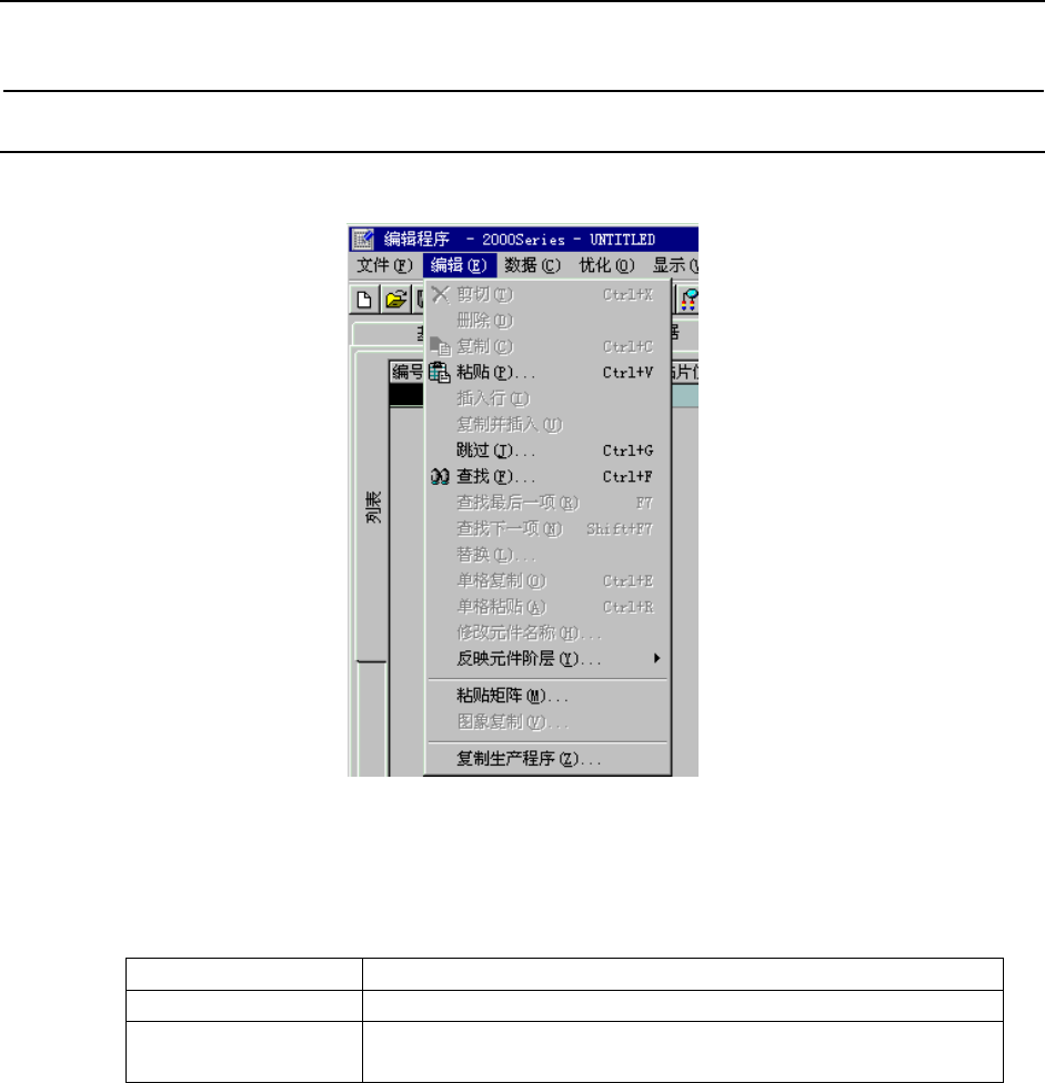 第 4 章 生产程序制作 Rev00 4-102 4-5 其他功能 4-5-1 编辑 4-5-1-1 编辑菜单 该功能是制作程序的辅助功能。 图 4-5-1 编辑菜单命令 ※ 范围选择 进行剪切或复制时,请预先选择删除或复制的范围,然后再进行操作。 范围选择以行为单位进行。 选择范围的方法 鼠标(跟踪球) 通过拖拽,则被选择的行呈反色显示。 键盘 按住“SHIFT”键的同时,按下“↓”或“↑”键,则被选 择 的行呈反色显示。 1) 剪切…