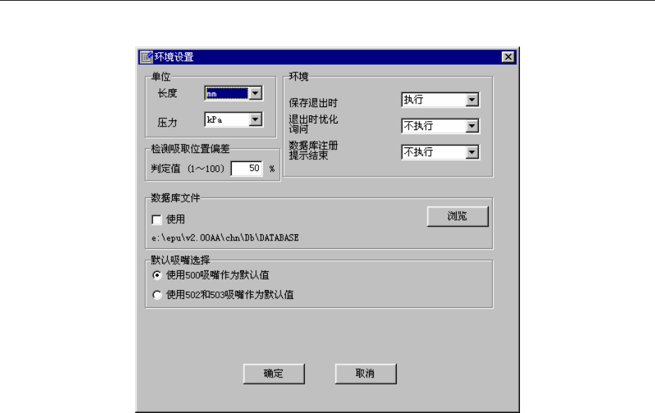第 4 章 生产程序制作 Rev00 4-120 4-5-3 环境设置 设置程序编辑中的环境。 从菜单栏中选择“文件”/“环境设置”,显示设置画面。 图 4 -5-21 环境设置 1) 单位类 选择编辑时的长度、压力的表示单位类。 ●长度…从mm、1/100mm、inch中选择。 ●压力…从kPa、级别中选择。 2) 操作环境 ① 保存结束时的状态 ●是:在下一次启动程序编辑时重新显示以下的项目。 1.工具栏显示、不显示 2.读入文件名…