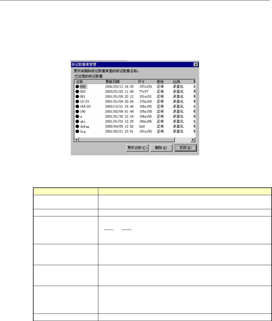 在一览表中显示数据库中储存的标记数据。各项目的含义如下。