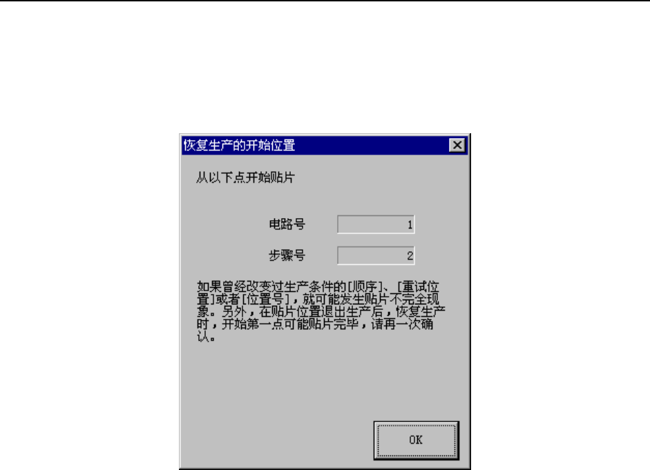 第 2 章 生产 Rev01 2-60 2-11-10 继续生产 当生产异常终止时(发生非同步情况, 生产异常终止), 可通过以下步骤继续进行生产。 但该 动作仅在至少有 1 个元件进行了吸取、贴片时进行。 2-11-10-1 生产异常终止 在异常终止的错误信息对话框中,按下“确认”按钮,显示如下画面。 图 2 -65 开始继续生产的位置 在此按下“OK”按钮,则返回生产条件画面。 开始下一次生产时, 将确认是否从上述位置开始生产。 但…
