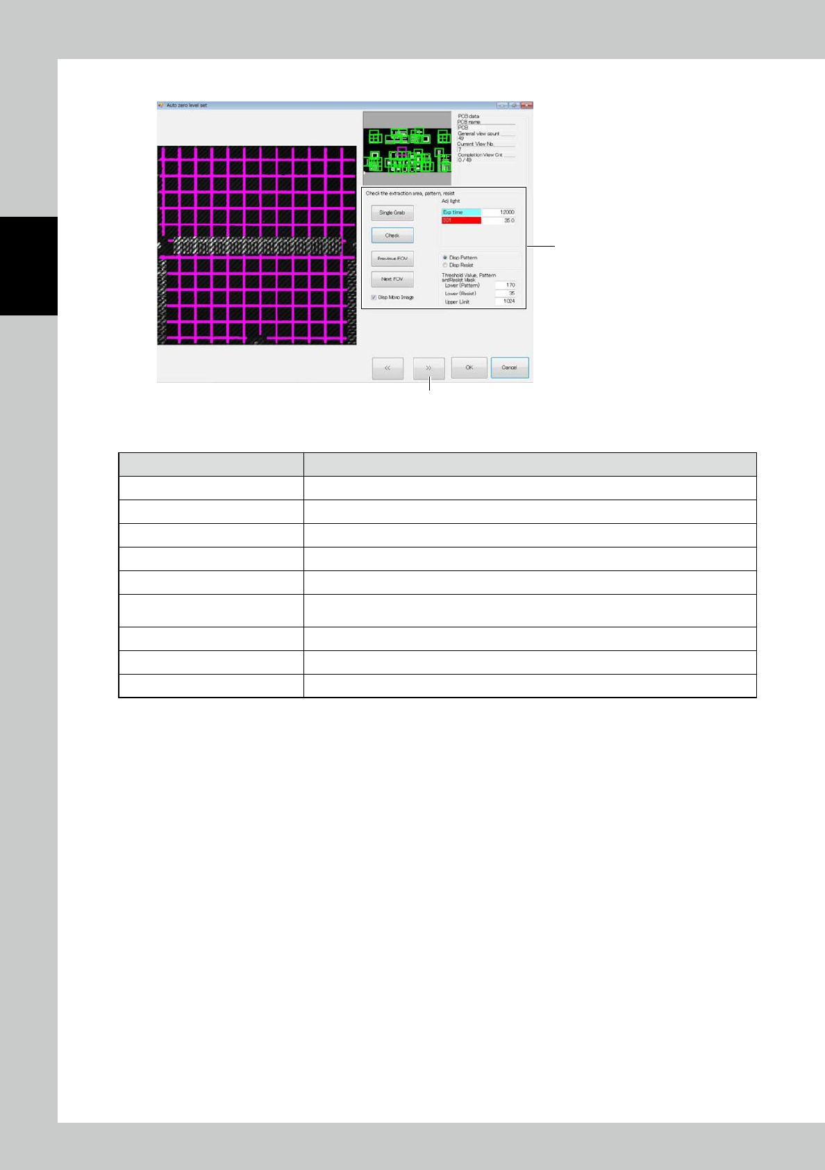 2-88 2 Operation 3. T ouch the [>>] button. The screen shown belo w is display ed. 4 5 242C2-KMN-00 4. Enter settings of pattern and resist extr action. Item Description Adj light Specify the height measurement str…