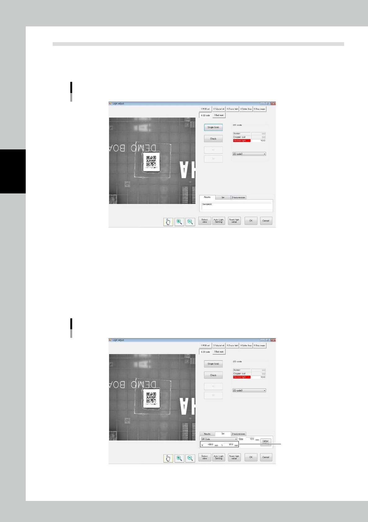 Adjustment") to adjust the coordinates of the 2D code and light amount.