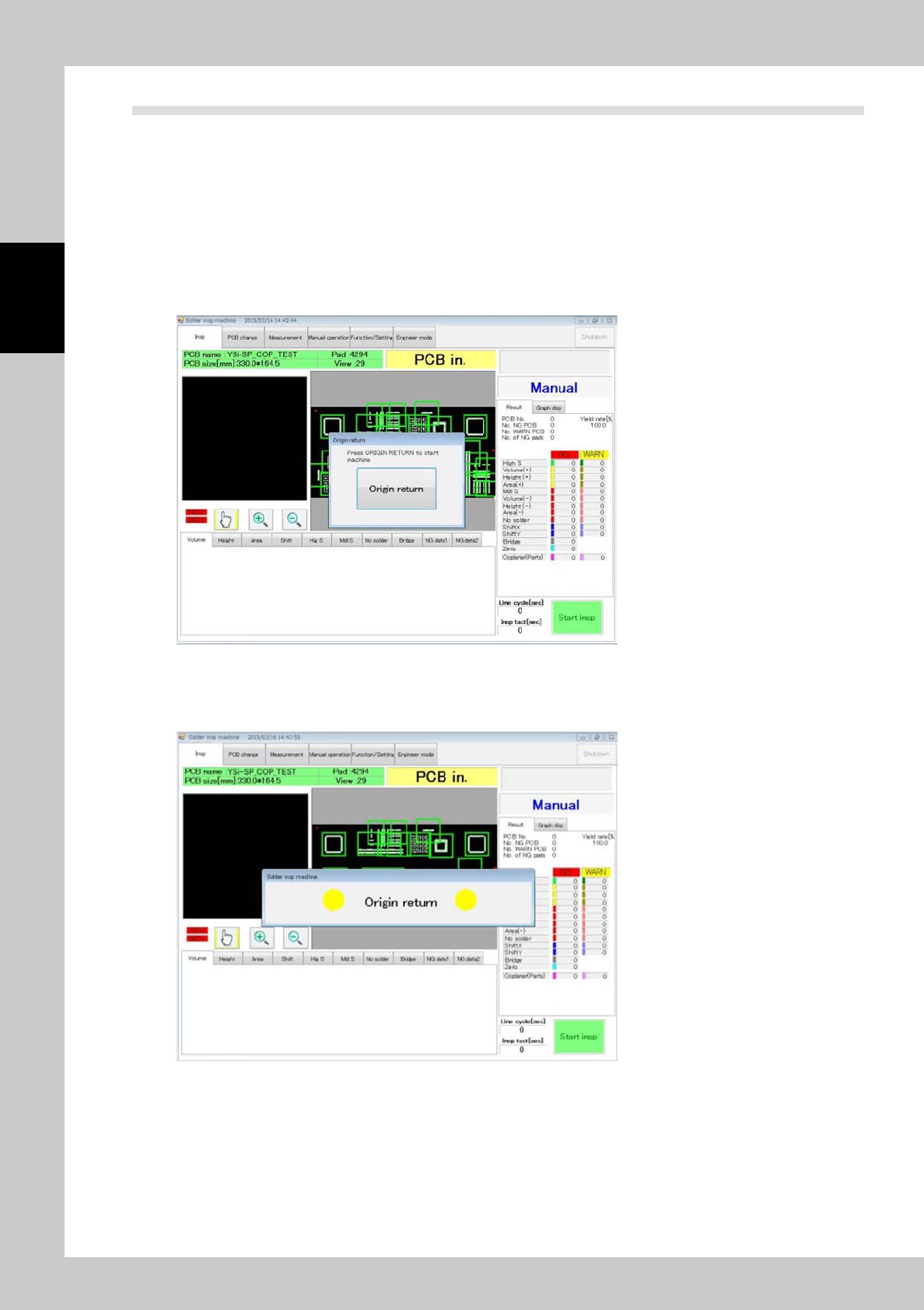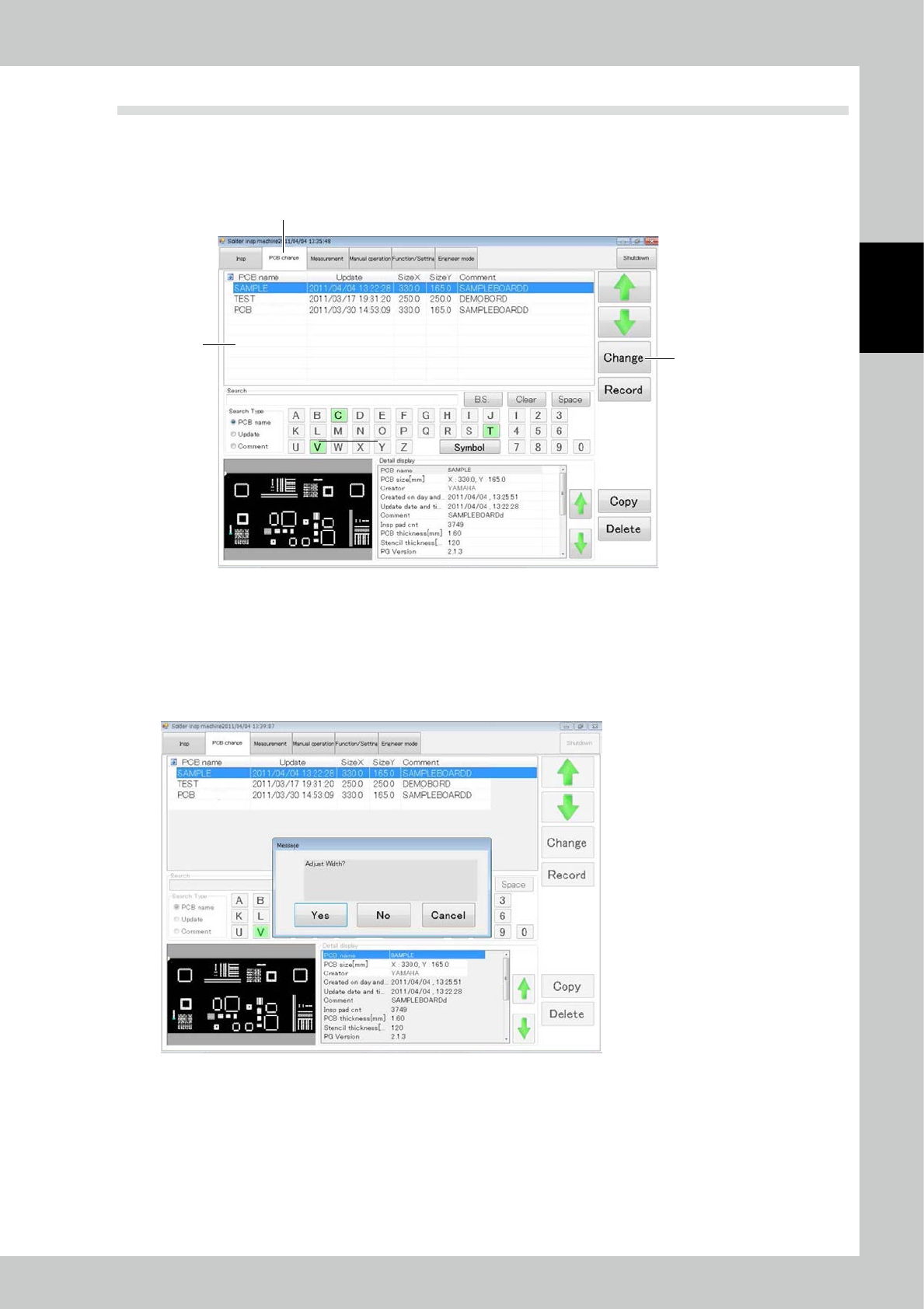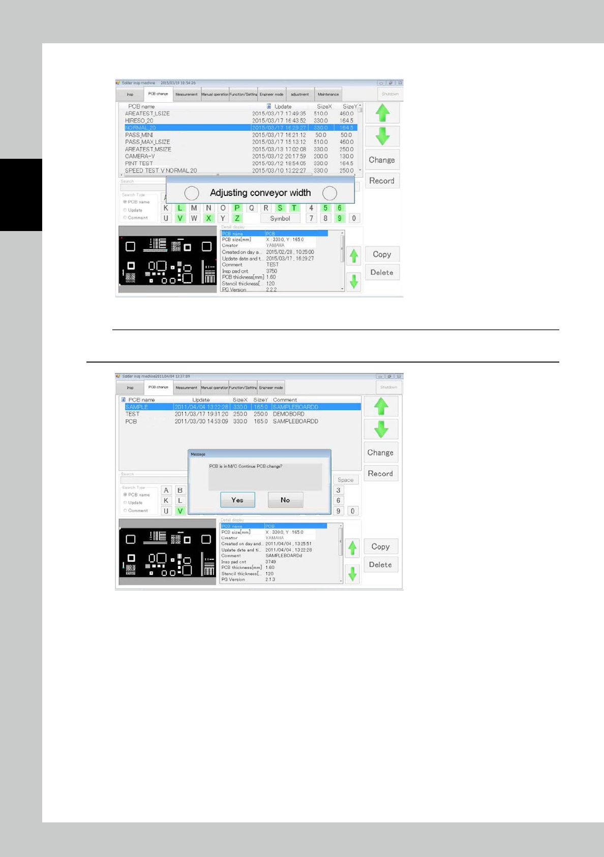 2-7 2 Operation 2.4 PCB Change Select the PCB (inspection program) to be inspected. If there is alread y a PCB inside the inspection machine, remove it first. (F or the PCB removing method, refer to "2.5.2 Unloading…