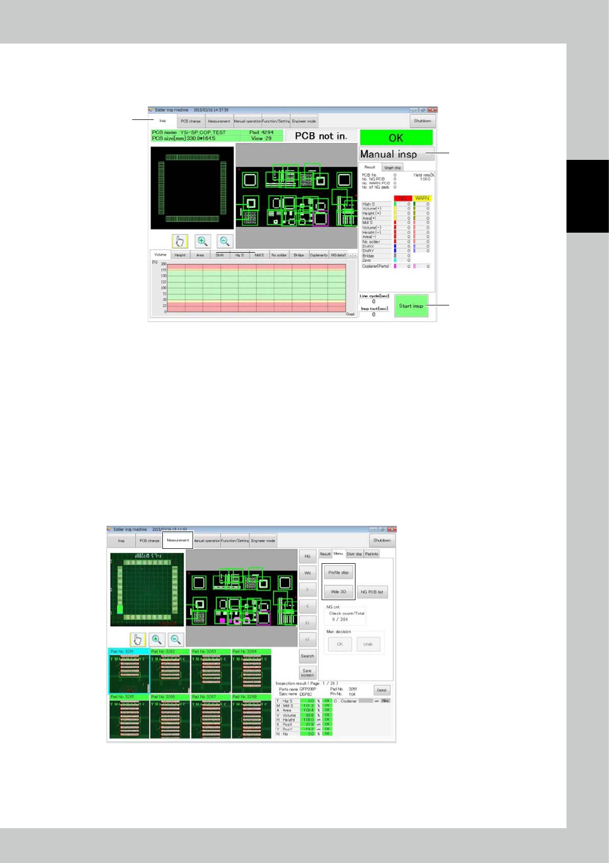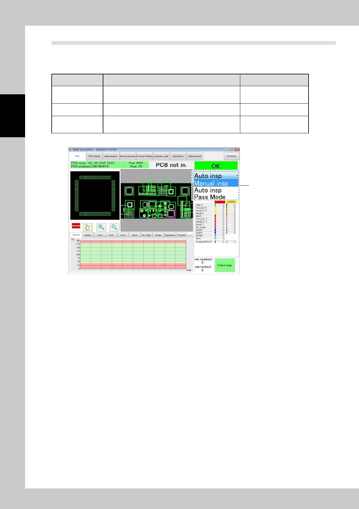2-10 2 Operation 2.6 Inspection After selecting the inspection mode and loading the PCB into the machine, execute inspection. T here are three inspection types: standalone inspection, automatic inspection and pass mode. …
